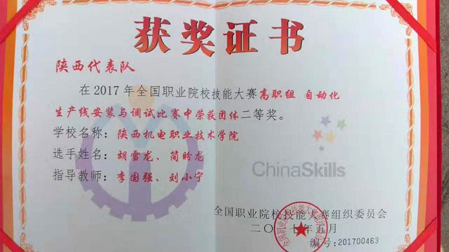 近日2017年全國職業(yè)院校技能大賽總決賽在天津主賽區(qū)落下帷幕,我院13機(jī)電高職2班胡雪龍、簡盼龍兩位同學(xué)在機(jī)電工程系李國強(qiáng)、高白川、劉小寧三位老師的精心指導(dǎo)下,首次代表陜西省參加自動(dòng)化生產(chǎn)線安裝與調(diào)試(高職組)項(xiàng)目,以出色的表現(xiàn)和精湛的技藝,榮獲團(tuán)體二等獎(jiǎng),充分展示了我院學(xué)生良好的動(dòng)手實(shí)踐及團(tuán)隊(duì)協(xié)作能力。