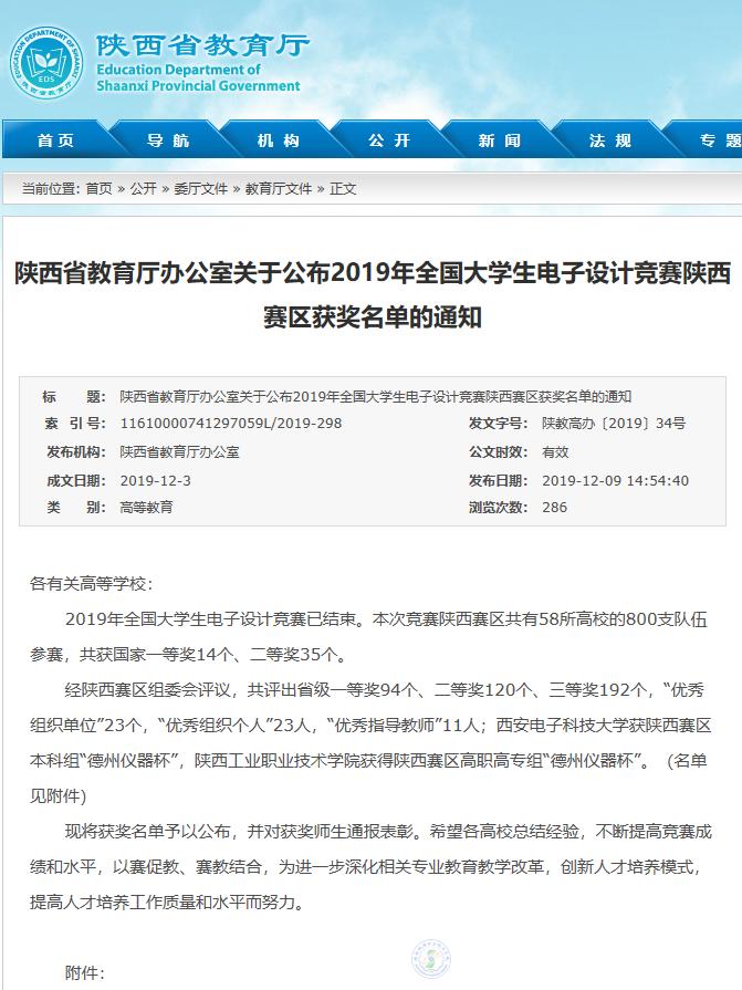 陜西省教育廳辦公室關(guān)于公布2019年全國大學(xué)生電子設(shè)計(jì)競賽陜西賽區(qū)獲獎名單的通知鏈接請點(diǎn)擊: