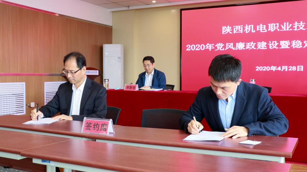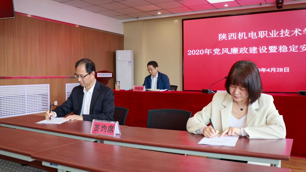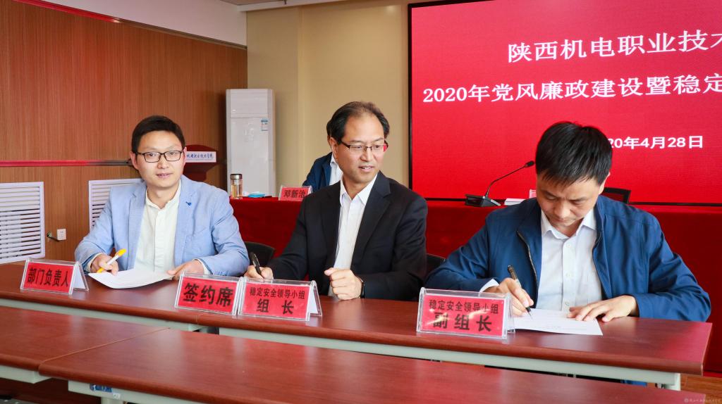 會上,黨委書記伊遜智代表學院黨委與分管領導、部門負責人代表簽訂《2020年陜西機電職業(yè)技術學院黨風廉政建設責任書》。穩(wěn)定安全領導小組組長伊遜智與穩(wěn)定安全領導小組副組長張新堂、部門負責人代表簽訂《2020年陜西機電職業(yè)技術學院穩(wěn)定安全工作責任書》。