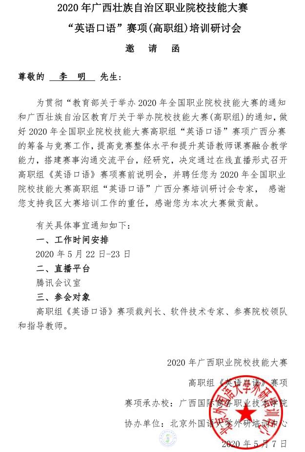 2020年5月22-23日,由廣西壯族自治區(qū)教育廳主辦,廣西國(guó)際商務(wù)職業(yè)技術(shù)學(xué)院、外語(yǔ)教學(xué)與研究出版承辦的廣西職業(yè)院校技能大賽英語(yǔ)口語(yǔ)賽項(xiàng)培訓(xùn)研討會(huì)隆重舉辦。為支持疫情防控工作,本次會(huì)議以線上研討的形式、依托騰訊會(huì)議平臺(tái)進(jìn)行。
