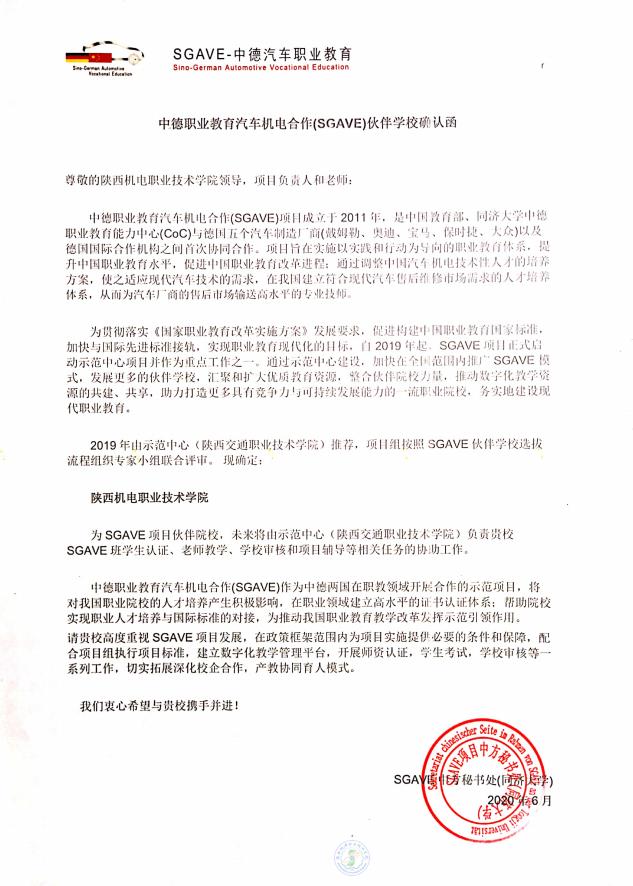 2020年6月,經(jīng)過“教育部中德職業(yè)教育汽車機電合作項目(SGAVE)”中方秘書處、同濟大學、中德職業(yè)教育能力中心和示范中心的推薦和評估,我校被確定為“教育部中德職業(yè)教育汽車機電合作項目(SGAVE)”伙伴學校。
