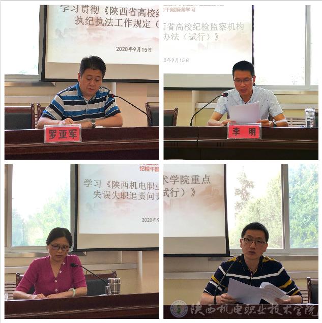 培訓(xùn)期間,學(xué)院紀(jì)委組織全體人員學(xué)習(xí)了陜西省紀(jì)委監(jiān)委和學(xué)院紀(jì)委相關(guān)制度文件。通過(guò)制度的學(xué)習(xí),為今后學(xué)院紀(jì)檢工作人員依規(guī)依紀(jì)依法履職明確了方向。
