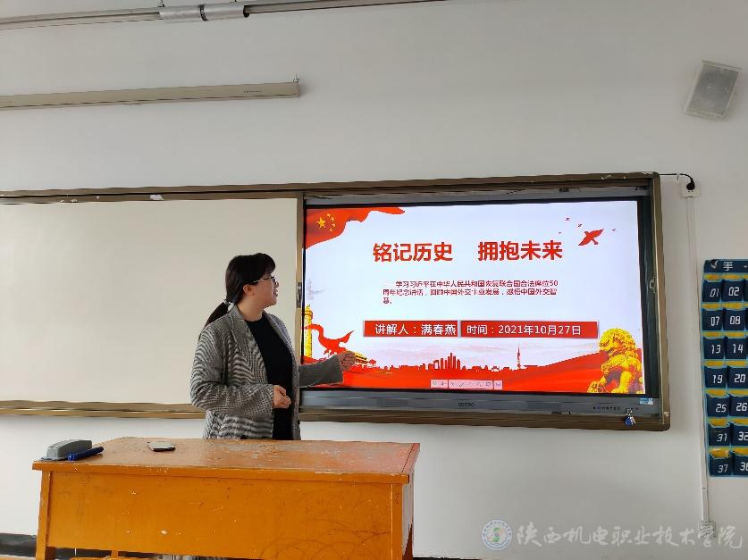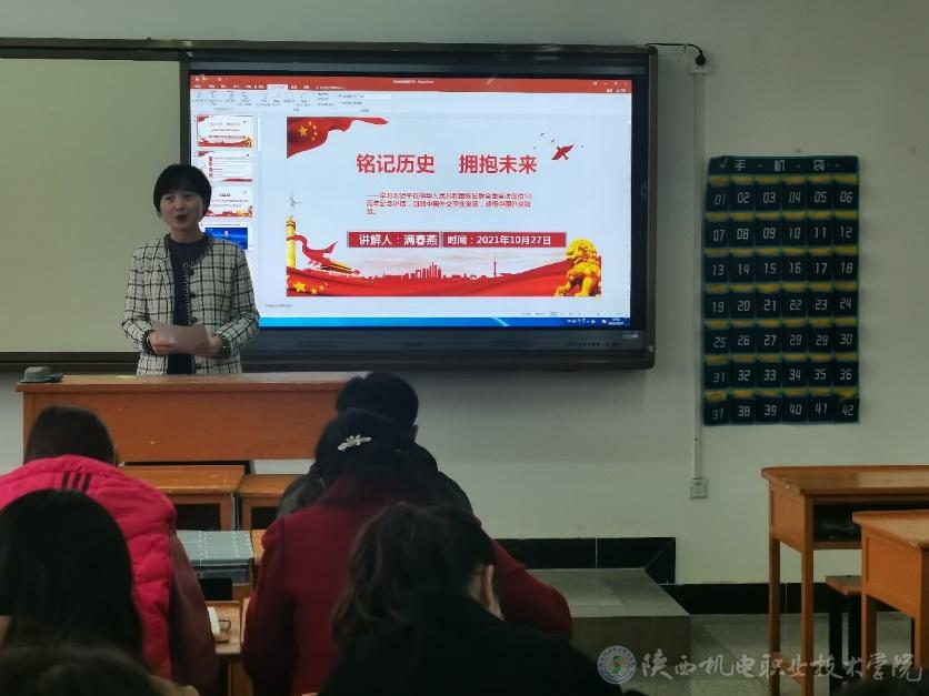會(huì)議的第一項(xiàng)內(nèi)容是支部書記講黨課。黨支部書記滿春燕同志以《銘記歷史,擁抱未來》為題為大家講授了專題黨課。她以習(xí)近平在中華人民共和國(guó)恢復(fù)聯(lián)合國(guó)合法席位50周年紀(jì)念講話為切入口,讓同志們感受并領(lǐng)悟習(xí)近平總書記講話中的精神內(nèi)核;帶領(lǐng)大家回顧了建國(guó)70多年崢嶸歲月中國(guó)在外交方面所取得的重大歷史成果;從歷史中感悟“凡益之道,與時(shí)偕行”“小智治事,大智治制”“大道之行,天下為公”的中國(guó)外交智慧。最后,她結(jié)合本次講課內(nèi)容啟發(fā)同志們要“銘記歷史、擁抱未來”,具體來說,就是要敬業(yè),不斷提升自己的教育教學(xué)水平,強(qiáng)大自身;講團(tuán)結(jié),以誠(chéng)待人,親和互助,相互提升;多交友,交流合作,完善自我,提升自我,發(fā)展自我;勤學(xué)史,用歷史映照現(xiàn)實(shí),遠(yuǎn)觀未來,從而做好自身、部門、學(xué)校各項(xiàng)事宜。