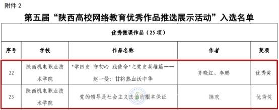 在“陜西高校網(wǎng)絡(luò)教育優(yōu)秀作品推選展示活動(dòng)”遴選中,由齊曉紅、李鵬老師創(chuàng)作的《“學(xué)四史 守初心 踐使命”之黨史英雄篇——趙一曼:甘將熱血沃中華》、陳歡老師創(chuàng)作的作品《黨的領(lǐng)導(dǎo)是社會(huì)主義法治的根本保證》獲優(yōu)秀微課作品組優(yōu)秀獎(jiǎng)。