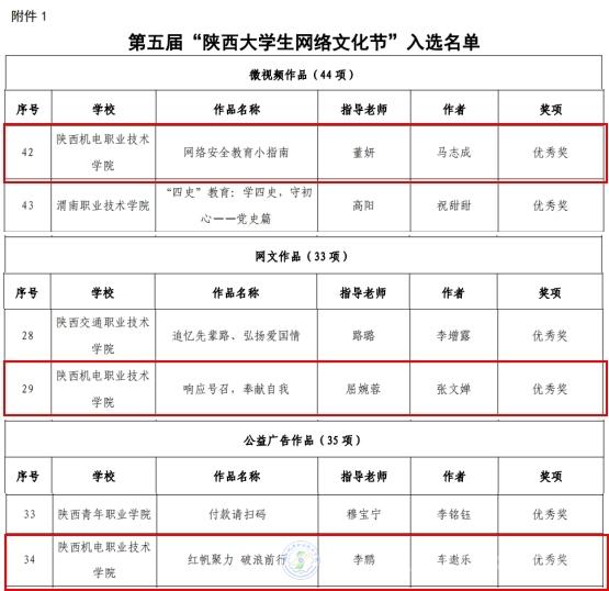 由董妍老師指導(dǎo),馬志成同學(xué)創(chuàng)作的作品《網(wǎng)絡(luò)安全教育小指南》獲微視頻組優(yōu)秀獎(jiǎng);由屈婉蓉老師指導(dǎo),張文嬋同學(xué)創(chuàng)作的作品《響應(yīng)號(hào)召,奉獻(xiàn)自我》獲網(wǎng)文組優(yōu)秀獎(jiǎng);由李鵬老師指導(dǎo),車(chē)遨樂(lè)同學(xué)創(chuàng)作的作品《紅帆聚力 破浪前行》獲公益廣告組優(yōu)秀獎(jiǎng)。