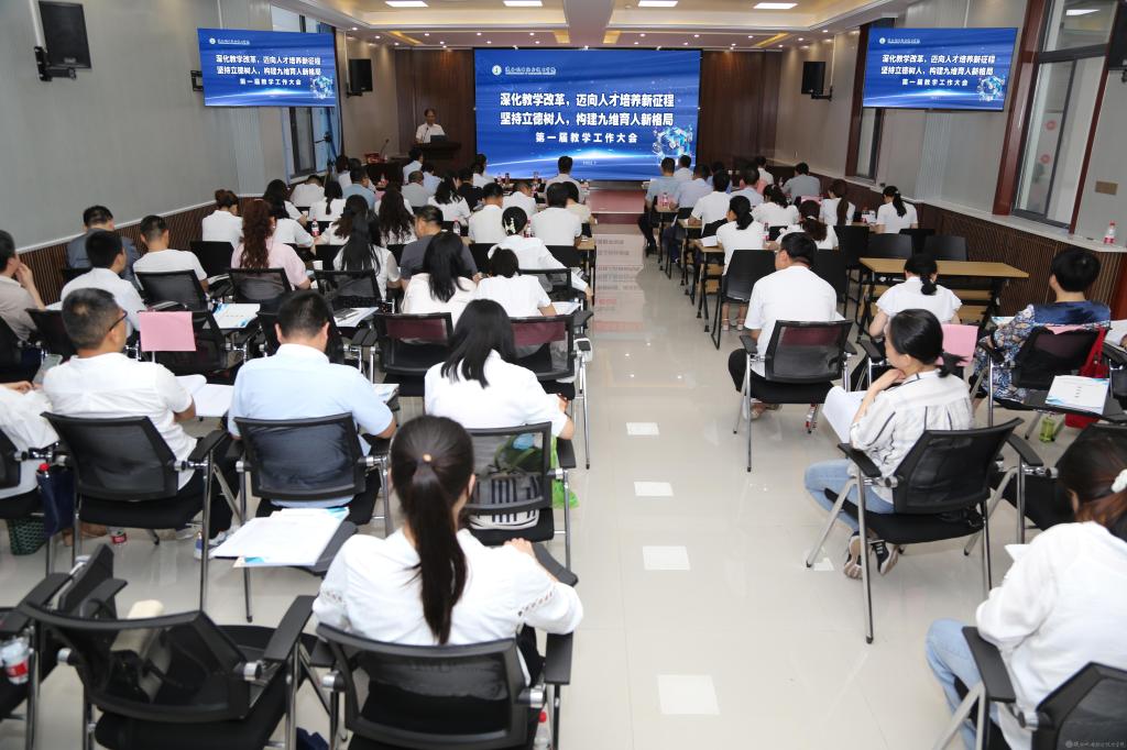 2021年是“十四五”順利啟航之年,也是學(xué)?!芭榔逻~坎”的關(guān)鍵之年,為了進(jìn)一步加強(qiáng)和規(guī)范教育教學(xué)管理,切實(shí)提高教育教學(xué)質(zhì)量,以良好的精神面貌迎接學(xué)校發(fā)展新局面,我校在蟠龍校區(qū)隆重舉行第一屆教學(xué)工作大會(huì)。學(xué)院黨委書(shū)記伊遜智;院長(zhǎng)、黨委副書(shū)記向紀(jì)明;黨委副書(shū)記、紀(jì)委書(shū)記齊曉軍;黨委委員、副院長(zhǎng)張克;黨委委員、院長(zhǎng)助理趙爭(zhēng)東出席本次大會(huì)。各二級(jí)教學(xué)單位、各部門(mén)主要負(fù)責(zé)人及全體老師參加了本次大會(huì)。會(huì)議由教務(wù)處長(zhǎng)白娟娟主持。本次大會(huì)設(shè)一個(gè)主會(huì)場(chǎng)、三個(gè)分會(huì)場(chǎng),采取直播方式進(jìn)行。