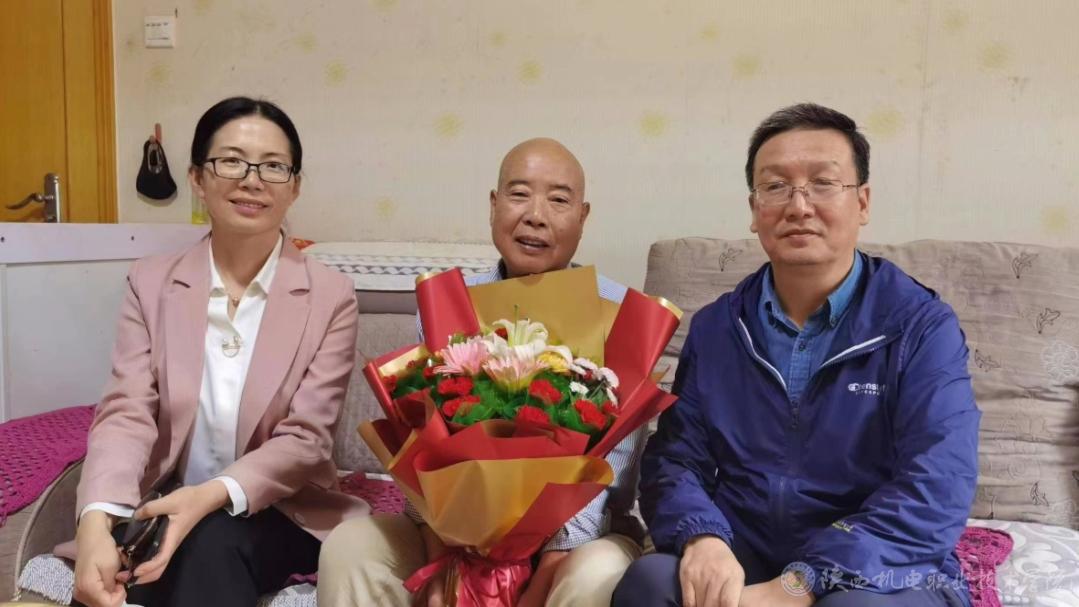 齊曉軍(右一)、張琴(左一)慰問退休教職工賈侃緒(左二)