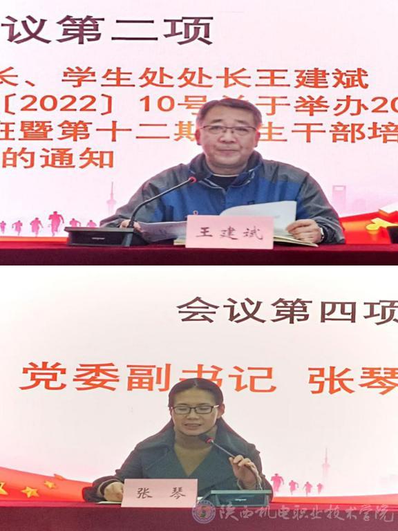 為深入學習貫徹黨的二十大精神,深入開展“青年馬克思主義者培養(yǎng)工程”,用黨的先進理論武裝、指引青年學子,11月14日,2022年“青馬工程”培訓班暨第十二期學生干部培訓班開班儀式在寶福路校區(qū)汽車機電大樓4樓視頻會議室舉行,蟠龍校區(qū)在博學樓一樓會議室同步收看。黨委副書記張琴,黨委學工部部長、學生處處長王建斌,馬克思主義學院副院長王樞,各二級學院團總支書記和全體學員參加儀式。開班儀式通過線上和線下兩種方式相結(jié)合,儀式由團委書記楊鵬主持。