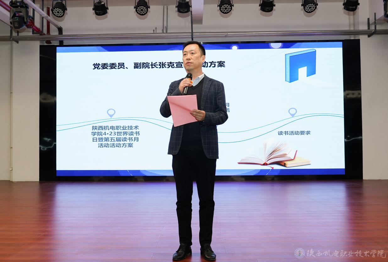 副院長(zhǎng)張克宣讀《陜西機(jī)電職業(yè)技術(shù)學(xué)院4·23世界讀書日暨第五屆讀書月活動(dòng)方案》