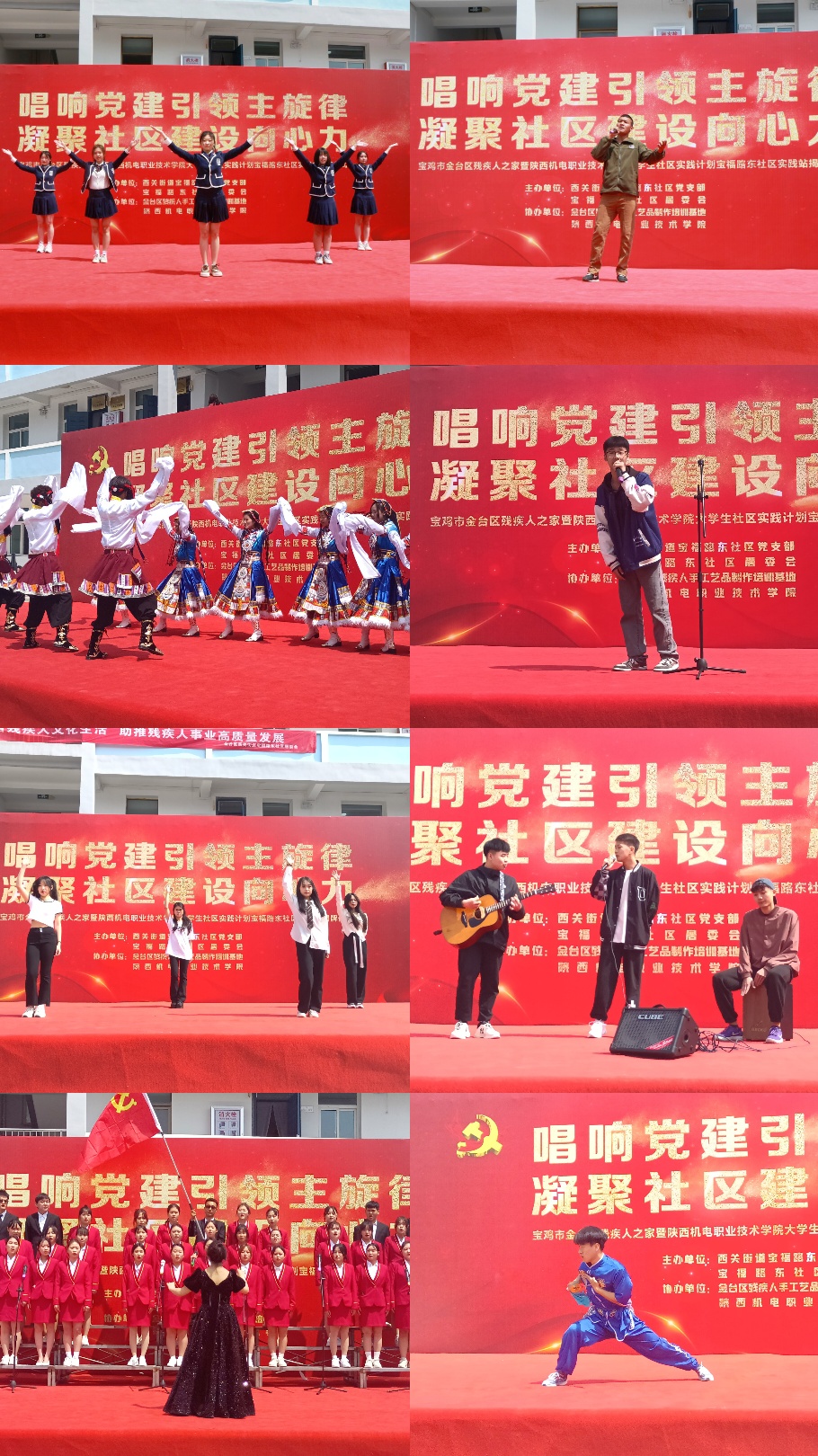 儀式上,王世鵬、張麗華、楊鵬、孟發(fā)軍、趙蘭、巨峰共同為陜西機(jī)電職業(yè)技術(shù)學(xué)院大學(xué)生社區(qū)實(shí)踐計(jì)劃寶福路東社區(qū)實(shí)踐站揭牌。隨后,我校大學(xué)生帶來了形式多樣、豐富多彩的文藝匯演。歌曲《唱支山歌給黨聽》、《至少還有你》、舞蹈《yes OK》、《鍋莊舞》、《相親相愛》、武術(shù)表演、吉他演奏等節(jié)目展現(xiàn)了我校青年大學(xué)生朝氣蓬勃、銳意進(jìn)取、充滿激情的精神面貌。文藝匯演表演形式新穎,內(nèi)容豐富,處處洋溢著青春的活力?,F(xiàn)場氣氛熱烈、高潮迭起,精彩的演出和忘我的投入贏得了全場一次次熱烈的掌聲。