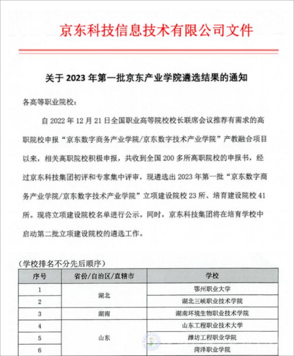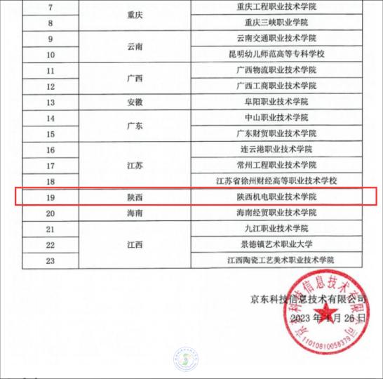 2023年5月4日,京東集團發(fā)布《關于2023年第一批京東產(chǎn)業(yè)學院遴選結(jié)果的通知》,公布了立項建設院校23所,陜西機電職業(yè)技術學院從參與的200多所高職院校中脫穎而出,成為陜西省唯一入選院校。