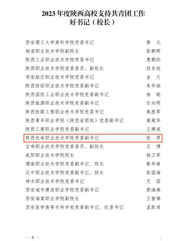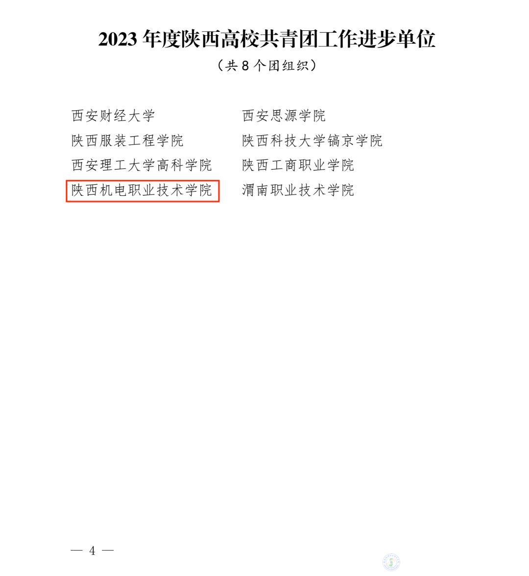 近日,共青團陜西省委,中共陜西省委教育工委發(fā)布《關(guān)于2023年度陜西高校共青團工作述職評議結(jié)果的通報》,陜西機電職業(yè)技術(shù)學(xué)院榮獲“2023年度陜西高校共青團工作進步單位”;學(xué)校黨委副書記張琴榮獲“2023年度陜西高校支持共青團工作好書記(校長)”;數(shù)字經(jīng)管學(xué)院團總支書記郭世強榮獲“2023年度陜西高校共青團工作先進個人”稱號。