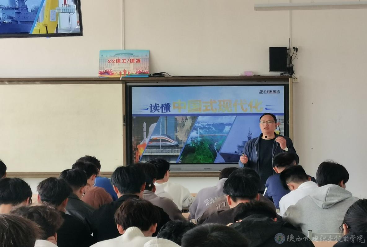 4月8日下午,陜西機電職業(yè)技術學院黨委副書記、院長向紀明在博學樓418教室為22鐵道工程專業(yè)學生上形勢與政策課,講授《讀懂中國式現(xiàn)代化》專題內(nèi)容。