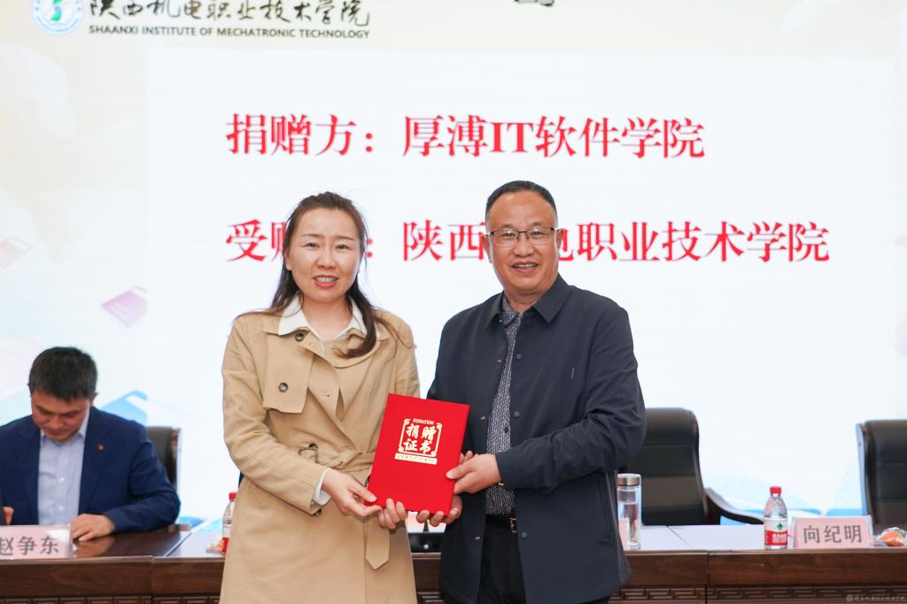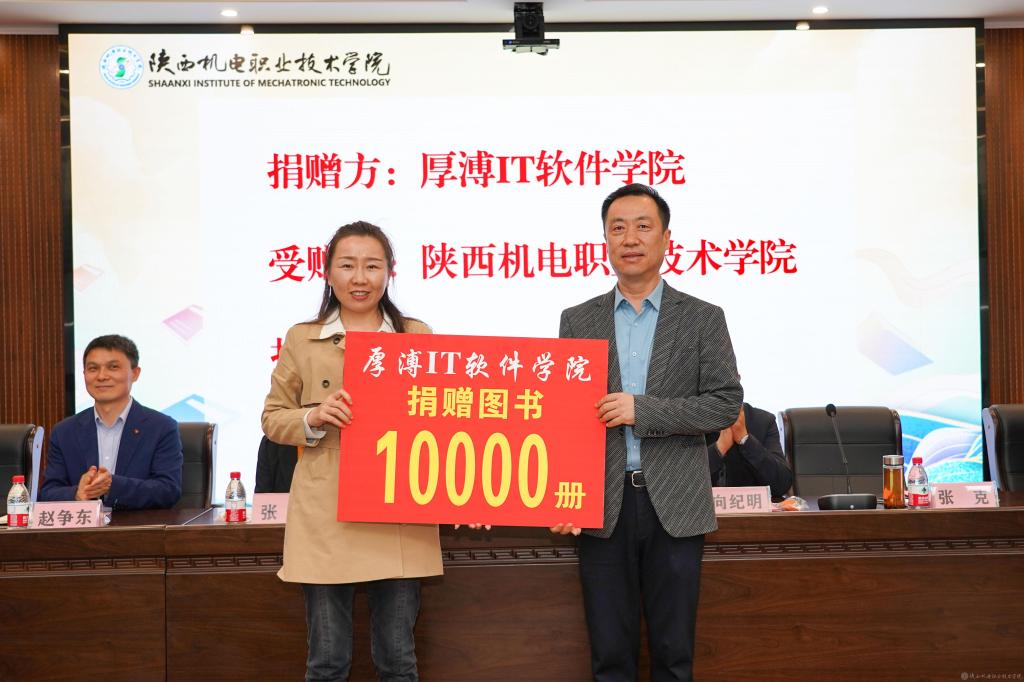 厚溥陜西公司總經(jīng)理葉靜代表厚溥IT軟件學(xué)院向我校圖書(shū)館捐贈(zèng)了圖書(shū)共計(jì)10000冊(cè),為學(xué)校的閱讀推廣活動(dòng)注入了新的活力。張克副院長(zhǎng)代表學(xué)校接受捐贈(zèng),向紀(jì)明院長(zhǎng)代表學(xué)校向厚溥IT軟件學(xué)院頒發(fā)了捐贈(zèng)證書(shū)。伊遜智書(shū)記代表學(xué)校發(fā)表了熱情洋溢的感謝辭。他提到,厚溥的圖書(shū)捐贈(zèng)不僅是對(duì)我校教育事業(yè)的關(guān)愛(ài)和支持,更是對(duì)學(xué)校發(fā)展的信任和期待,同時(shí),伊?xí)浺蚕蛉熒l(fā)出倡議,希望大家能夠珍惜這份寶貴的圖書(shū)資源,認(rèn)真閱讀、深入思考、勇于創(chuàng)新,不斷提高自己的綜合素質(zhì)和能力水平。