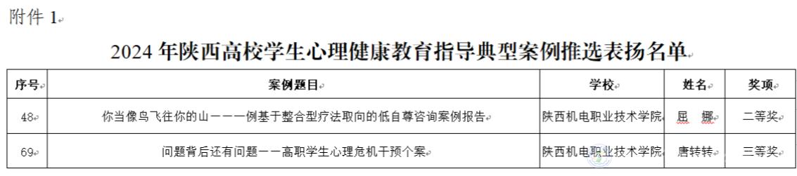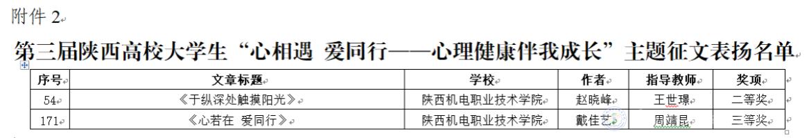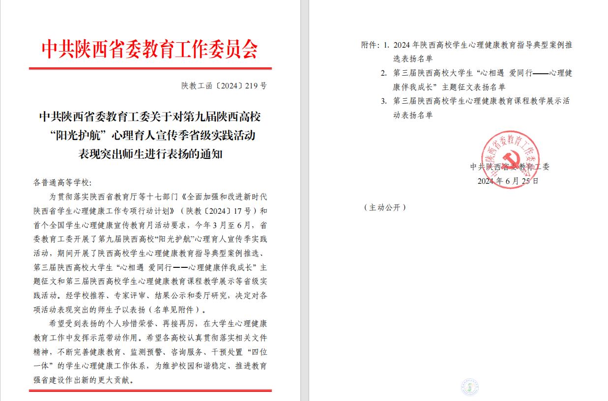 近日,《中共陜西省委教育工委關(guān)于對第九屆陜西高校“陽光護(hù)航”心理育人宣傳季省級實(shí)踐活動表現(xiàn)突出師生進(jìn)行表揚(yáng)的通知》公布,我校教師屈娜的《你當(dāng)像鳥飛往你的山——一例基于整合療法取向的低自尊咨詢案例報告》和教師唐轉(zhuǎn)轉(zhuǎn)的《問題背后還有問題——高職學(xué)生心理危機(jī)干預(yù)個案》分別榮獲典型案例二、三等獎;由學(xué)生趙曉峰撰寫、教師王世璟指導(dǎo)的文章《于縱深處觸摸陽光》和學(xué)生戴佳藝撰寫、教師周靖昆指導(dǎo)的文章《心若在 愛同行》分別榮獲第三屆陜西高校大學(xué)生“心相遇 愛同行——心理健康伴我成長”主題征文二、三等獎。