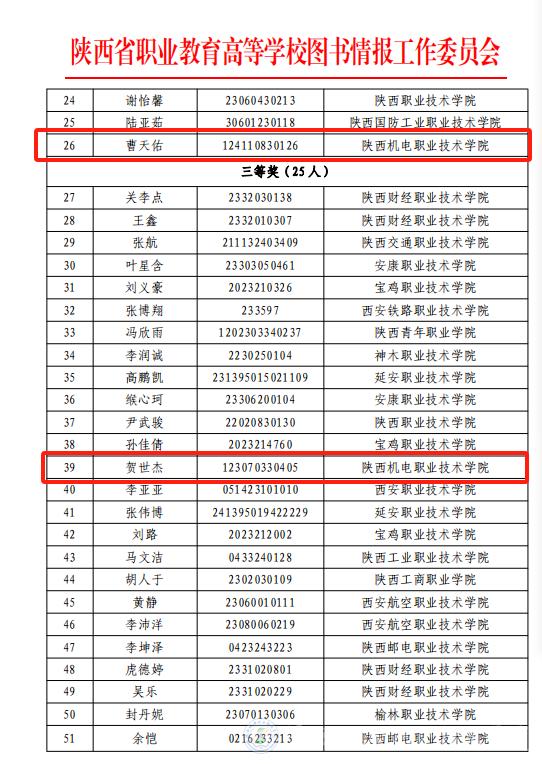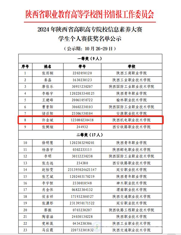 10月26日,由陜西省職業(yè)教育高等學校圖書情報工作委員會主辦的2024年陜西省高職高專院校信息素養(yǎng)大賽暨“中文在線杯”第六屆全國大賽選拔賽圓滿落幕。此次大賽吸引了全省21所高職院校的84名選手參與。經(jīng)過激烈角逐,我校智能制造學院學生許金斌脫穎而出,榮獲一等獎,鐵道工程學院學生曹天佑榮獲二等獎,電子信息學院學生賀世杰榮獲三等獎。其中,許金斌和曹天佑兩位同學入圍國賽資格名單。