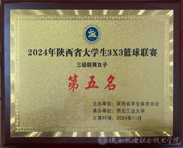 為進一步推動我省高校陽光體育運動,豐富校園體育文化生活,促進大學生身心健康,近日,由陜西省學生體育協(xié)會主辦的2024年陜西省大學生3X3籃球聯(lián)賽在西北工業(yè)大學舉行。陜西機電職業(yè)技術(shù)學院榮獲三級聯(lián)賽女子組第五名的優(yōu)異成績,同時獲評體育道德風尚獎。