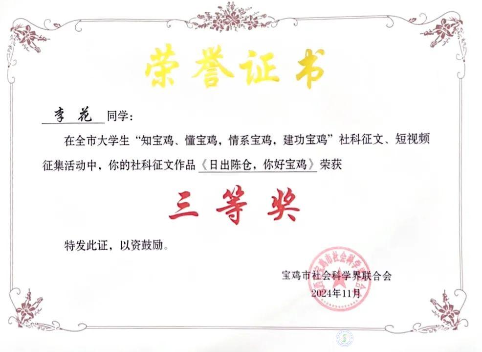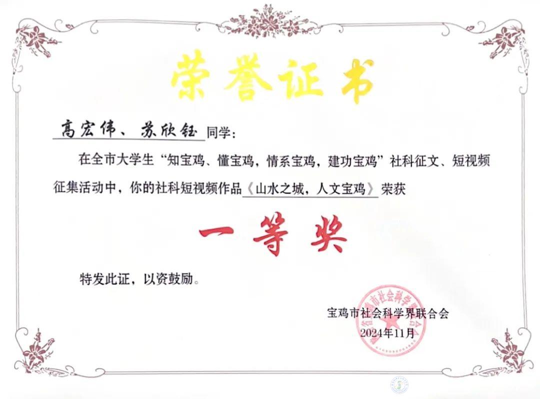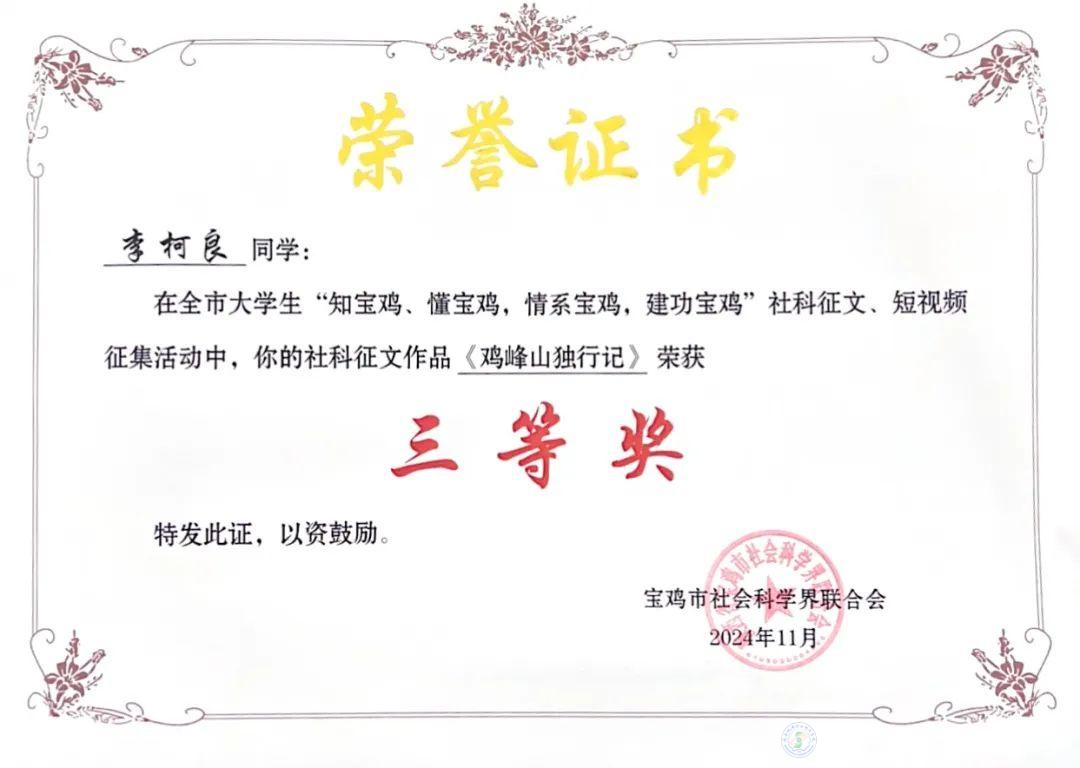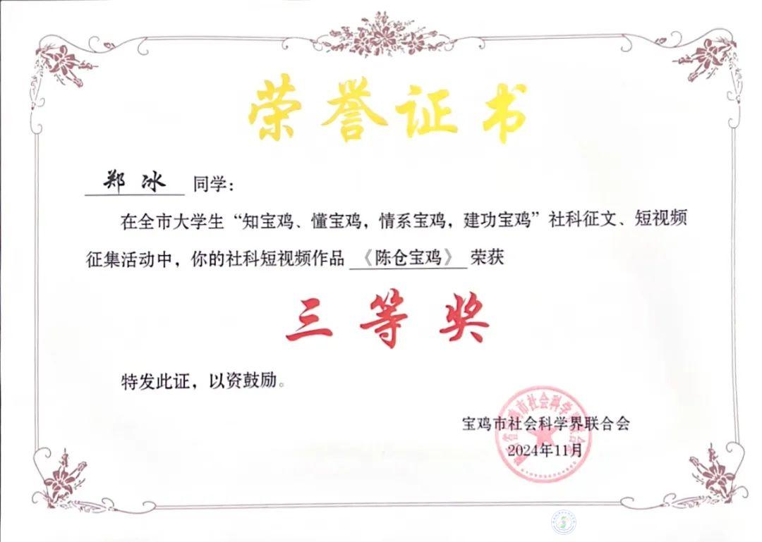 根據(jù)《關(guān)于在全市在校大學(xué)生中開(kāi)展“知寶雞、懂寶雞,情系寶雞,建功寶雞”社科征文、短視頻征集活動(dòng)的通知》,由寶雞市社科聯(lián)聯(lián)合在寶高校共同舉辦的“知寶雞、懂寶雞,情系寶雞,建功寶雞”社科征文、短視頻征集活動(dòng)評(píng)選結(jié)果出爐,我校學(xué)子在征集活動(dòng)中榮獲一等獎(jiǎng)1項(xiàng)、三等獎(jiǎng)3項(xiàng),刷新最好成績(jī),實(shí)現(xiàn)歷史性突破。