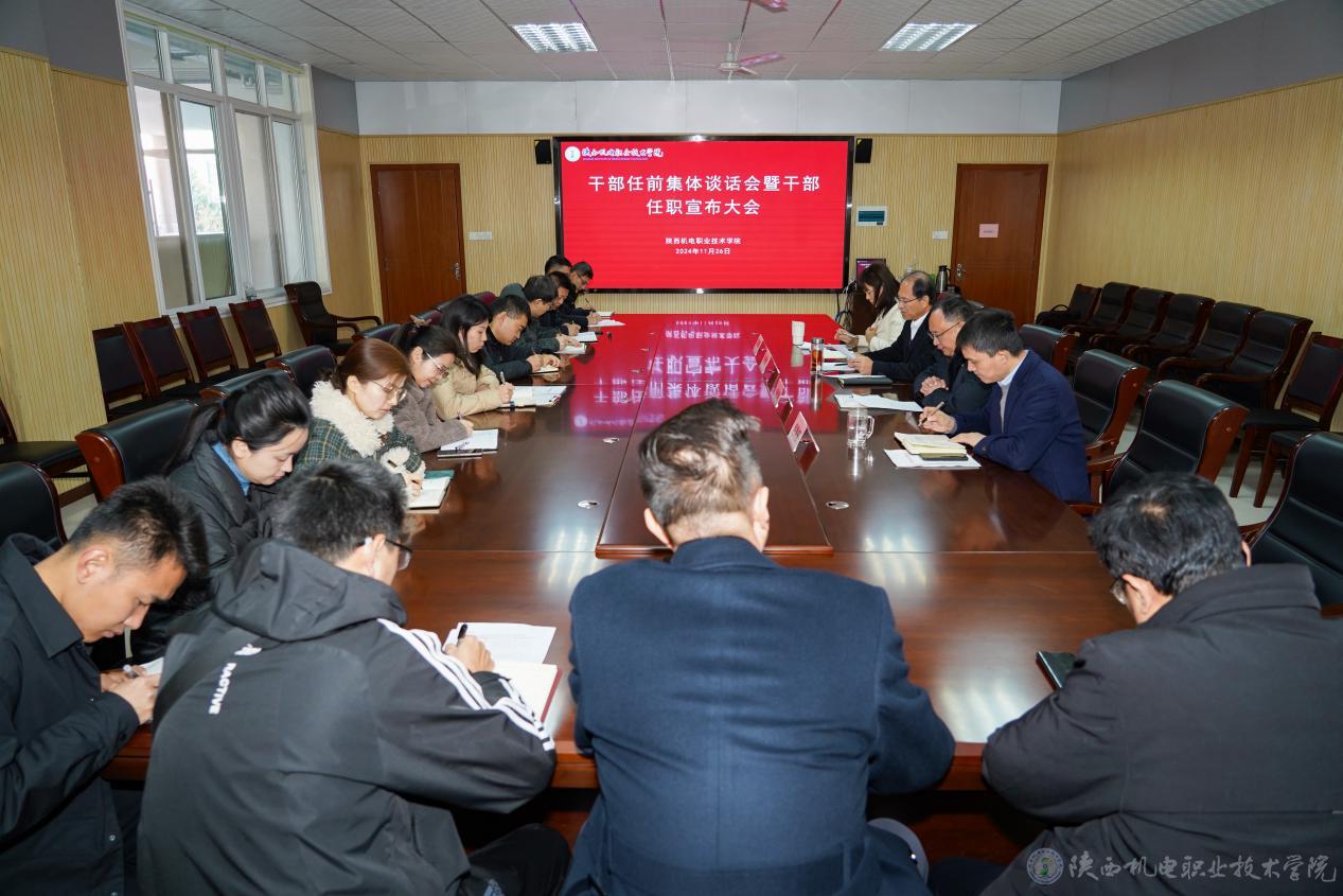 11月26日上午,陜西機電職業(yè)技術學院黨委在蟠龍校區(qū)圖書館二樓會議室召開新任職干部任前集體談話會暨干部任職宣布大會。黨委書記伊遜智出席會議并講話,黨委副書記、紀委書記陳紅梅,黨委委員、院長助理、組織部部長趙爭東,新任職干部參加會議。會議由黨委副書記、院長向紀明主持。
