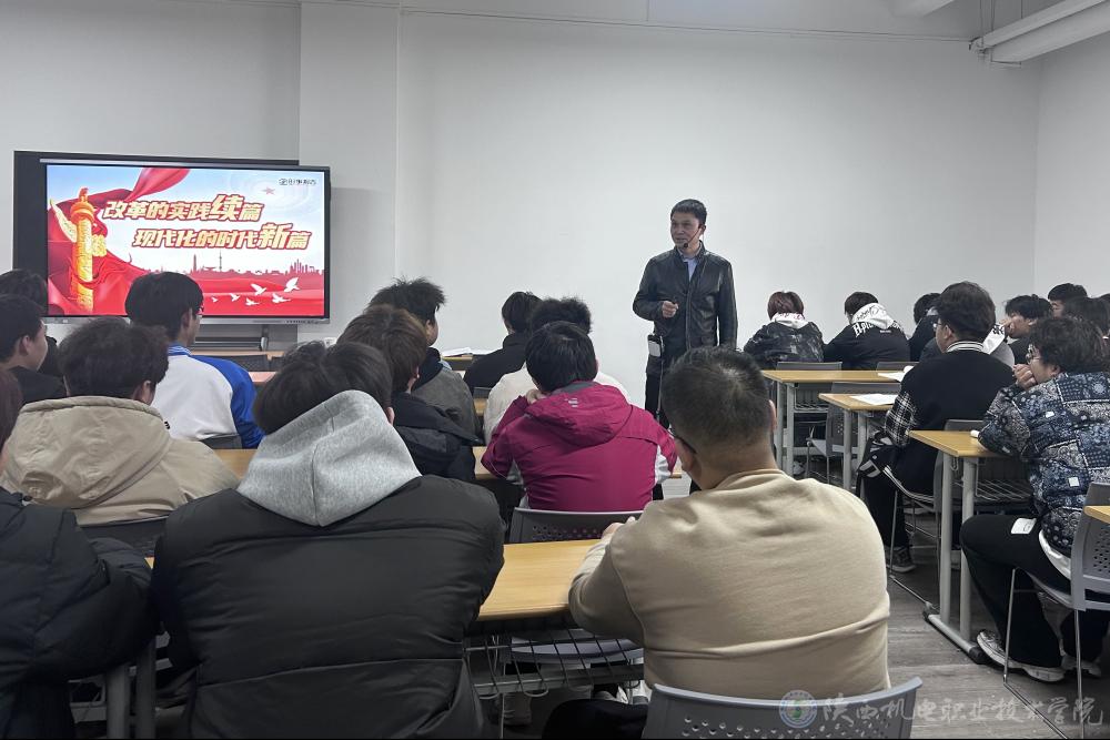 11月22日下午,陜西機(jī)電職業(yè)技術(shù)學(xué)院黨委委員、院長助理趙爭東在行知樓西212教室為24機(jī)電技術(shù)7、8合班學(xué)生上形勢(shì)與政策課,講授《改革的實(shí)踐續(xù)篇 現(xiàn)代化的時(shí)代新篇》專題內(nèi)容。