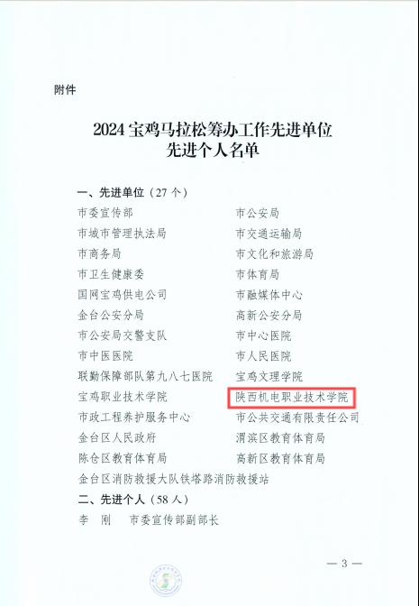 為確保馬拉松的順利舉行,近日,由寶雞市人民政府主辦,2024年寶雞馬拉松鳴槍開跑。陜西機(jī)電職業(yè)技術(shù)學(xué)院積極響應(yīng)共青團(tuán)寶雞市委的號(hào)召,積極宣傳、廣泛招募志愿者,經(jīng)過層層選拔,最終遴選出750名志愿者為參加馬拉松、半程馬拉松、歡樂跑3項(xiàng)賽事的2.5萬余選手提供志愿服務(wù)工作。我校被授予2024寶雞馬拉松籌辦工作“先進(jìn)集體”榮譽(yù)稱號(hào);我校團(tuán)委干事林妍君,青年志愿者服務(wù)中心學(xué)生干部雍小娥、王伯俊被授予“先進(jìn)個(gè)人”榮譽(yù)稱號(hào)。