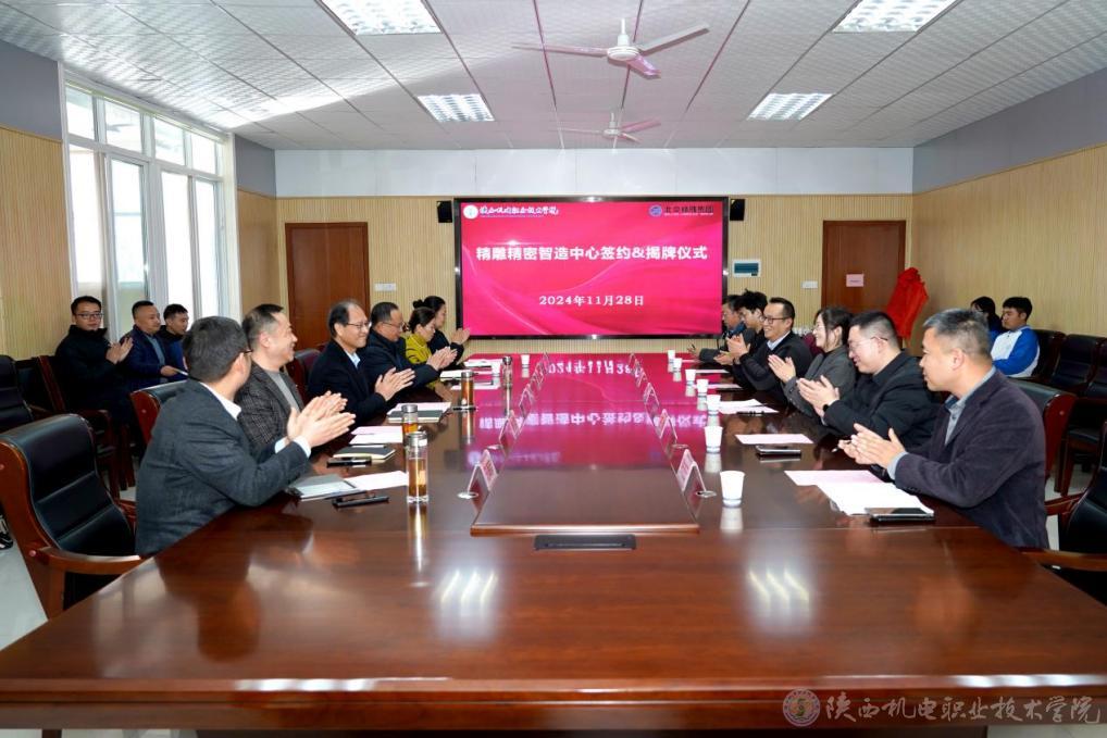 11月28日,陜機電精雕精密智造中心簽約揭牌儀式在圖書館二樓會議室舉行,北京精雕科技集團有限公司(以下簡稱“北京精雕公司”)行政總監(jiān)李文華、北京精雕公司教育總監(jiān)關(guān)山,陜西機電職業(yè)技術(shù)學(xué)院黨委書記伊遜智,黨委副書記、院長向紀(jì)明等參加揭牌儀式。儀式由黨委委員、副院長張克主持。