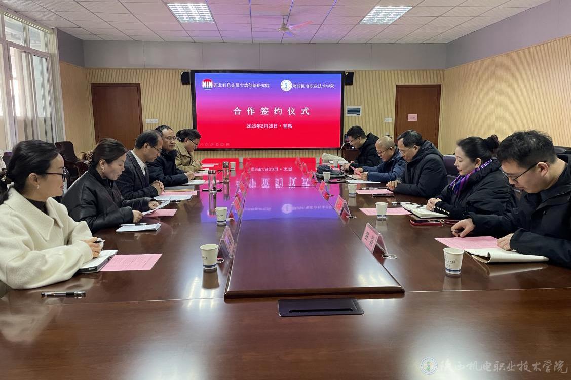 2月25日,陜西機(jī)電職業(yè)技術(shù)學(xué)院與西北有色金屬寶雞創(chuàng)新研究院合作簽約儀式在二樓會(huì)議室舉行。西北有色金屬寶雞創(chuàng)新研究院院長趙永慶、副院長肖松濤,陜西機(jī)電職業(yè)技術(shù)學(xué)院黨委書記伊遜智,黨委副書記、院長向紀(jì)明出席。簽約儀式由校企合作處處長白娟娟主持。