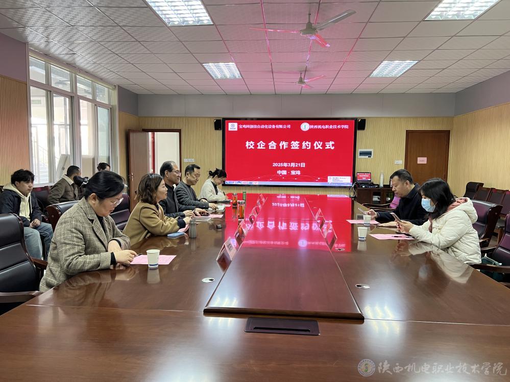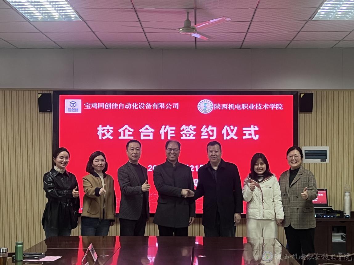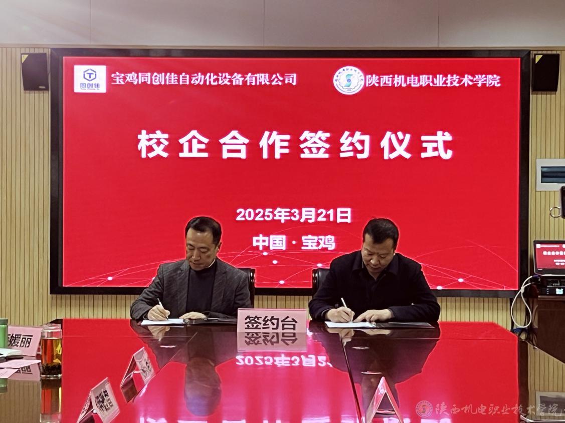 3月21日上午,陜西機(jī)電職業(yè)技術(shù)學(xué)院與寶雞同創(chuàng)佳自動(dòng)化設(shè)備有限公司校企合作簽約儀式在學(xué)院圖書館二樓會(huì)議室隆重舉行。寶雞同創(chuàng)佳自動(dòng)化設(shè)備有限公司總經(jīng)理劉朝龍、行政經(jīng)理呂艷妮,陜西機(jī)電職業(yè)技術(shù)學(xué)院黨委書記伊遜智,黨委委員、副院長張克出席簽約儀式。會(huì)議由校企合作處處長白娟娟主持。