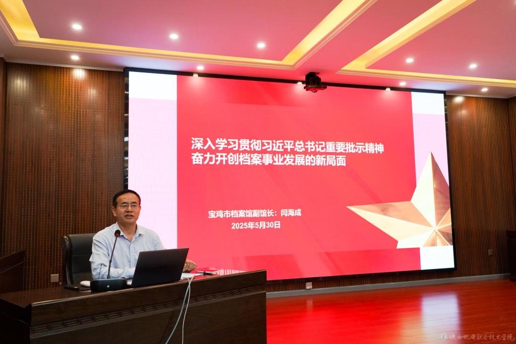 閆海成在講話中介紹了近年來寶雞市檔案館的創(chuàng)新發(fā)展成果,校地雙方未來在資源共享、人才培養(yǎng)、文化宣傳等領(lǐng)域深度合作。他在題為《深入學(xué)習(xí)貫徹習(xí)近平總書記重要批示精神 奮力開創(chuàng)檔案事業(yè)發(fā)展的新局面》的主題報(bào)告中,從理論到實(shí)踐系統(tǒng)闡釋了新時(shí)代檔案工作的使命與方向。