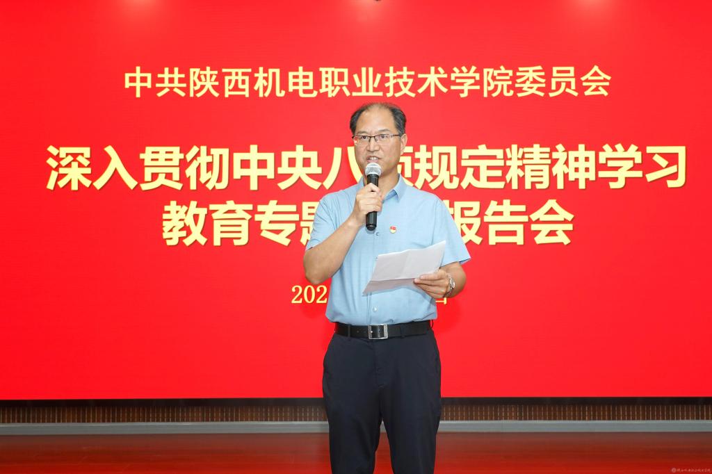 6月17日下午,學校黨委在蟠龍校區(qū)博學樓111會議室舉行深入貫徹中央八項規(guī)定精神學習教育專題輔導(dǎo)報告會,邀請省紀委監(jiān)委第四監(jiān)督檢查室副主任趙曉波同志以《學習領(lǐng)會習近平總書記關(guān)于加強黨的作風建設(shè)重要論述,深入貫徹中央八項規(guī)定精神》為題作了專題輔導(dǎo)報告。報告會由學校黨委書記伊遜智主持,校領(lǐng)導(dǎo)班子成員、科級以上干部、教學部門系主任(室主任),人事處、財務(wù)處、資產(chǎn)管理處、后勤保障處、質(zhì)控辦、新校區(qū)建設(shè)辦公室、教務(wù)處、學生處、保衛(wèi)處等部門工作人員,全體輔導(dǎo)員共100余人聆聽了報告。