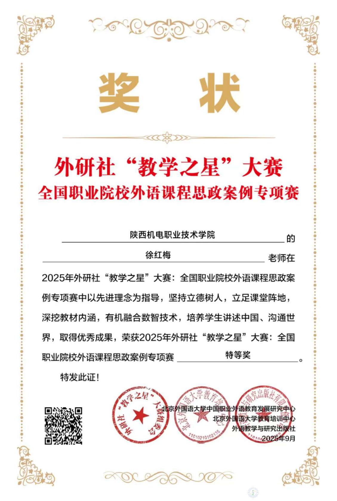 近日,2025年外研社“教學(xué)之星”大賽全國(guó)職業(yè)院校外語(yǔ)課程思政案例專項(xiàng)賽圓滿落幕。陜西機(jī)電職業(yè)技術(shù)學(xué)院基礎(chǔ)部英語(yǔ)教研室徐紅梅老師憑借扎實(shí)的教學(xué)功底和獨(dú)具創(chuàng)新的思政案例設(shè)計(jì),在高職英語(yǔ)組賽道脫穎而出,榮獲全國(guó)特等獎(jiǎng),為學(xué)校贏得殊榮。