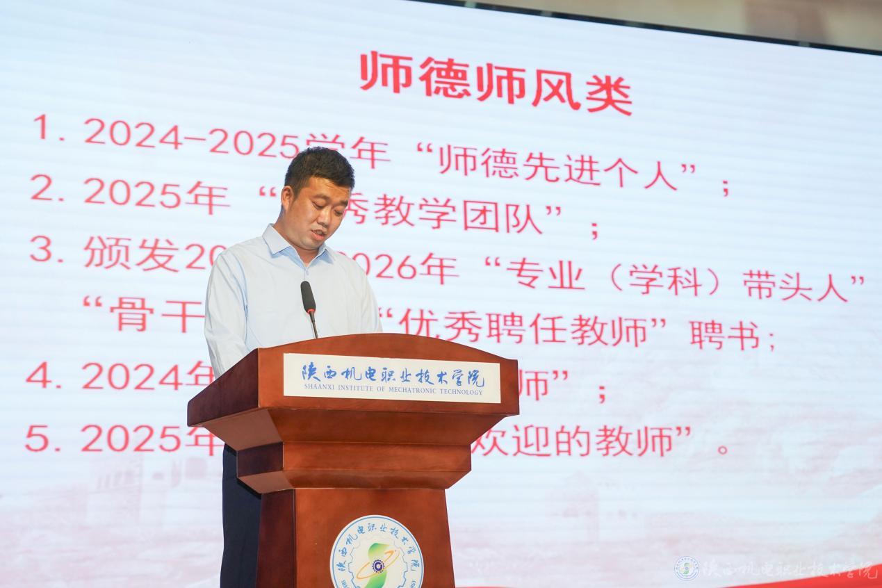 以教育家精神鑄魂強師,譜寫教育強國建設華章。9月10日下午,陜西機電職業(yè)技術學院第四十一個教師節(jié)慶祝暨表彰大會在寶福路校區(qū)大禮堂隆重舉行。黨委書記伊遜智,黨委委員、副院長張克,黨委委員、院長助理趙爭東,黨委委員、宣傳部部長李明出席大會,全體教師參加。會議由黨委副書記張琴主持。