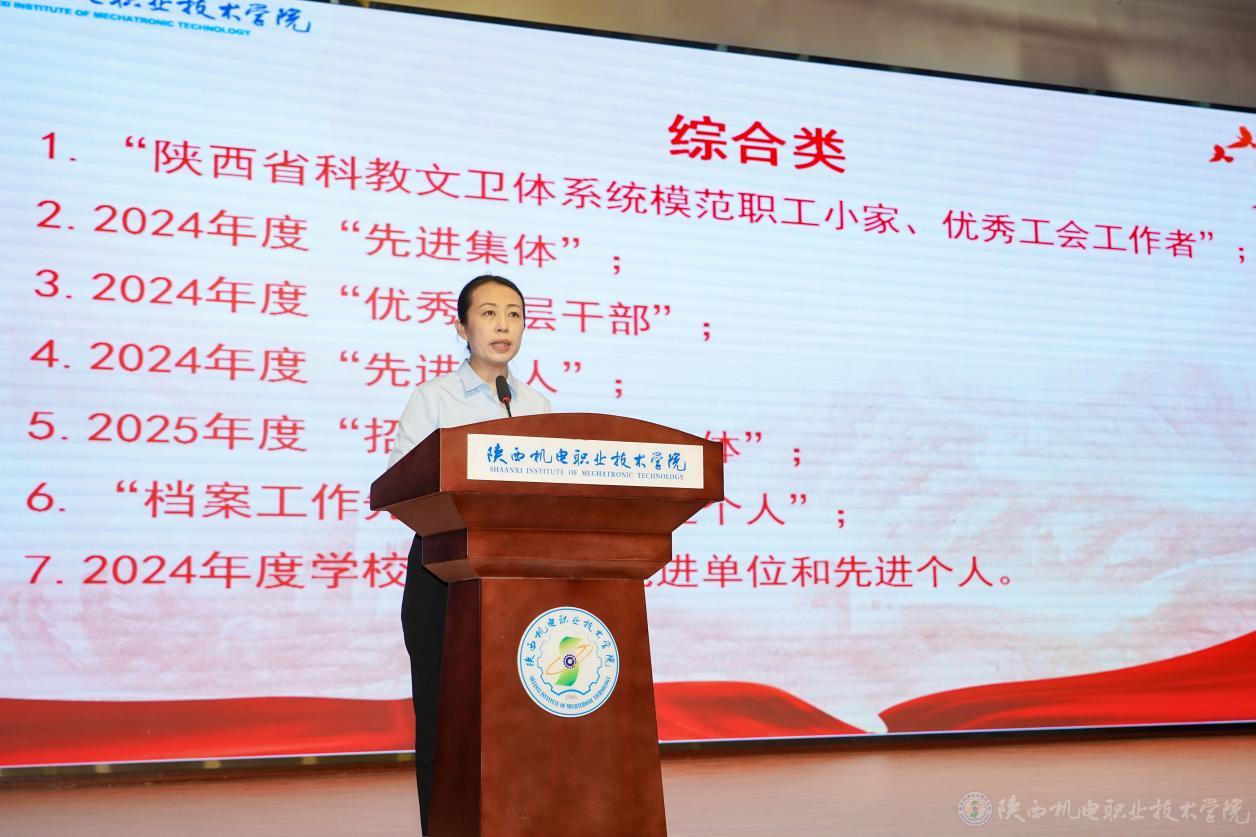 黨政辦公室主任康健宣讀“陜西省科教文衛(wèi)體系統(tǒng)模范職工小家、優(yōu)秀工會工作者”、2024年度“先進集體”、2024年度“優(yōu)秀中層干部”、2024年度“先進個人”、2025年度“招生工作先進集體”“檔案工作先進集體和先進個人”、2024年度學校統(tǒng)計工作先進單位和先進個人表彰文件。