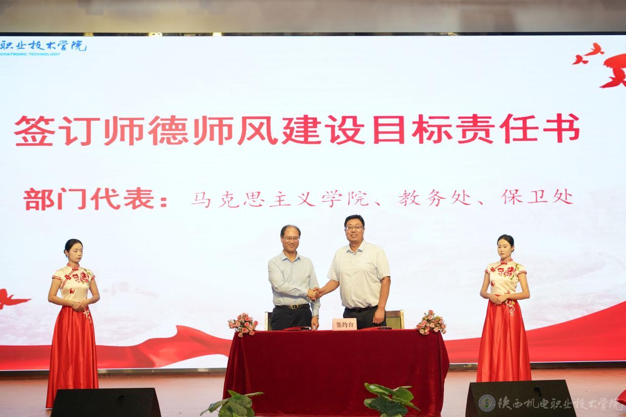 伊遜智與馬克思主義學院王康、教務處白娟娟、保衛(wèi)處常小凱簽訂師德師風建設目標責任書,并頒發(fā)《師德師風制度匯編》《違反教師職業(yè)行為十項準則的典型案例手冊》。