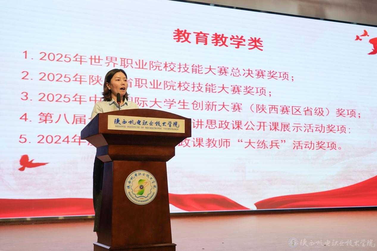 教務處處長白娟娟宣讀2025年世界職業(yè)院校技能大賽總決賽(爭奪賽)獎項、2025年陜西省職業(yè)院校技能大賽獎項、2025年中國國際大學生創(chuàng)新大賽(陜西賽區(qū)省級)獎項、第八屆全國高校大學生講思政課公開課展示活動獎項、2024年度陜西高校思政課教師“大練兵”活動獎項獲獎名單。