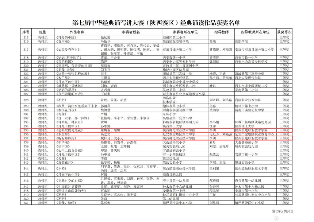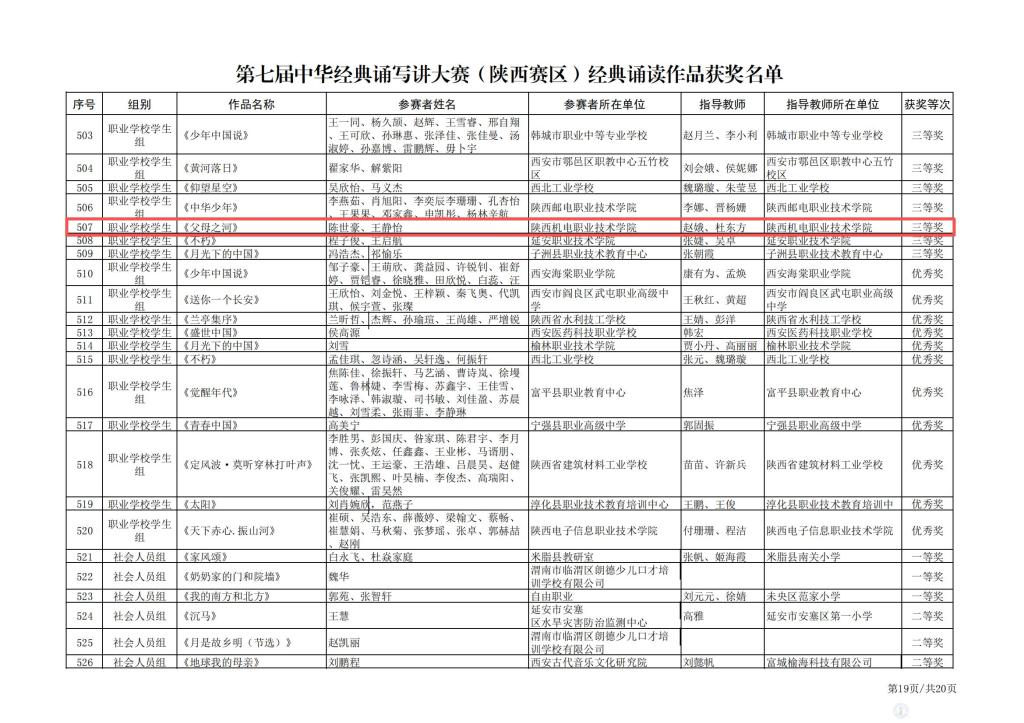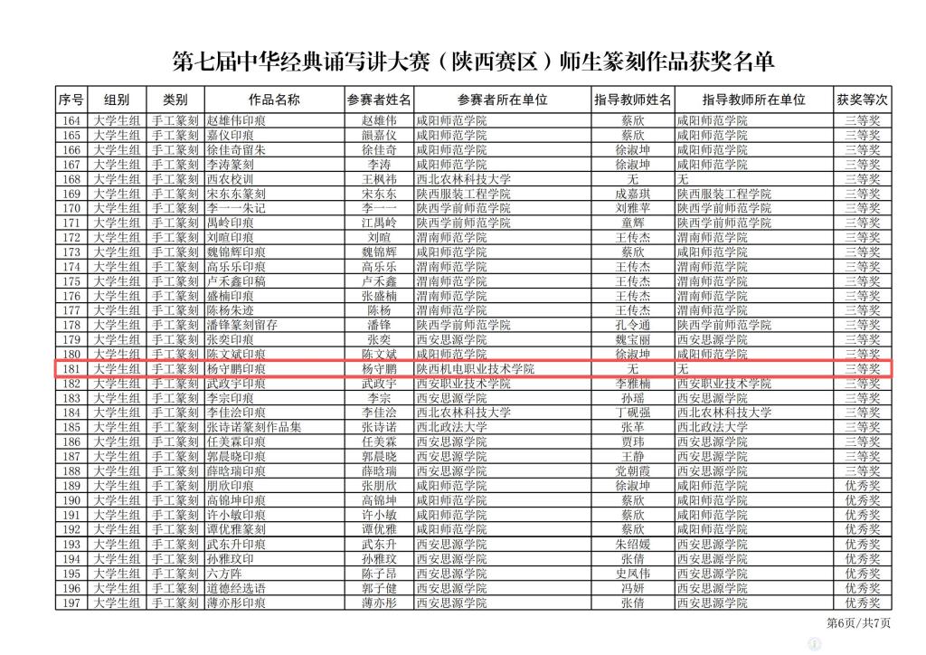 9月11日,陜西省教育廳辦公室公布了第七屆中華經(jīng)典誦寫講大賽(陜西賽區(qū))評審結(jié)果。陜西機電職業(yè)技術(shù)學(xué)院選送的作品《會唱歌的鳶尾花》(屈婉蓉、屈娜)、《聽聽那冷雨》(魏籽琦、武小元)榮獲經(jīng)典誦讀類教師組三等獎;作品《光的贊歌》(沈佳楠、劉子月、孫良梅、譚鋒)、《父母之河》(陳世豪、王靜怡)分別獲得學(xué)生組二等獎和三等獎。作品《楊守鵬印痕》(楊守鵬)榮獲師生篆刻類大學(xué)生組三等獎。