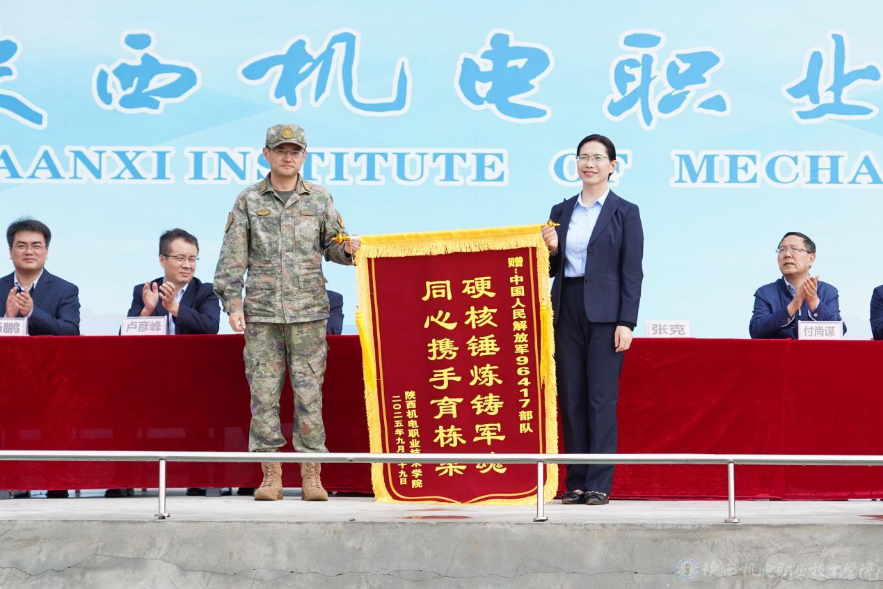 校領(lǐng)導(dǎo)代表學(xué)校向承訓(xùn)部隊贈送錦旗,向官兵們的辛勤付出與悉心指導(dǎo)表達(dá)誠摯感謝。