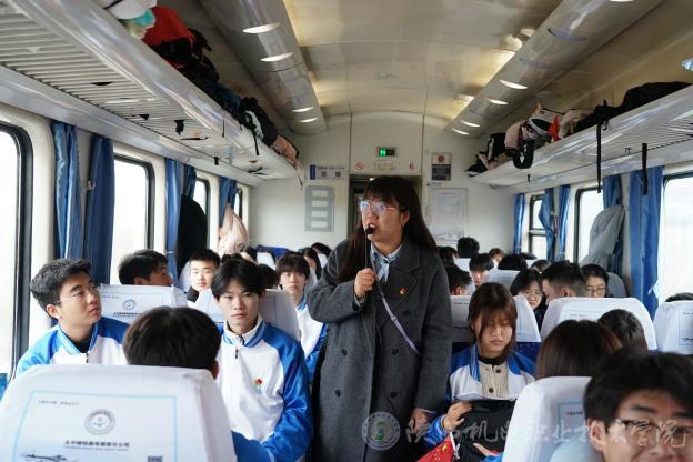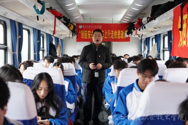 實(shí)踐活動(dòng)以車(chē)廂內(nèi)的思政教學(xué)正式拉開(kāi)帷幕。馬克思主義學(xué)院教師石剛、林妍君分別從抗日戰(zhàn)爭(zhēng)的波瀾壯闊,到南泥灣開(kāi)墾的艱苦奮斗;從平凡英雄張思德的默默奉獻(xiàn),到習(xí)近平總書(shū)記在梁家河插隊(duì)的青春歲月,深入淺出的講解讓學(xué)子們沉浸聆聽(tīng),眼神中滿是對(duì)歷史的敬畏與對(duì)革命精神的向往。隨后,激昂的紅歌《歌唱祖國(guó)》在車(chē)廂內(nèi)響起,師生齊聲高歌,為此次圣地行奠定了濃厚紅色基調(diào)。