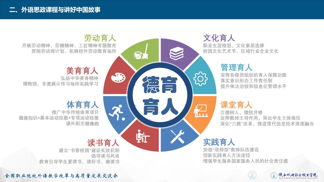 李明副教授依據(jù)我校“九維育人”教育理念,向全國職教人分享了我校構(gòu)建“三全育人”“五育并舉”的人才培養(yǎng)體系,并以“引導學生立大志、明大德、成大才、擔大任,努力成長為擔當民族復興大任的時代新人”為己任,以“外語+”為切入點,從“外語課程思政”與“意識形態(tài)陣地”“講好中國故事”以及“人才培養(yǎng)目標”三者關(guān)系,深入剖析了“大思政”格局下外語課程思政的建設路徑。獲得現(xiàn)場學者的一致熱評。