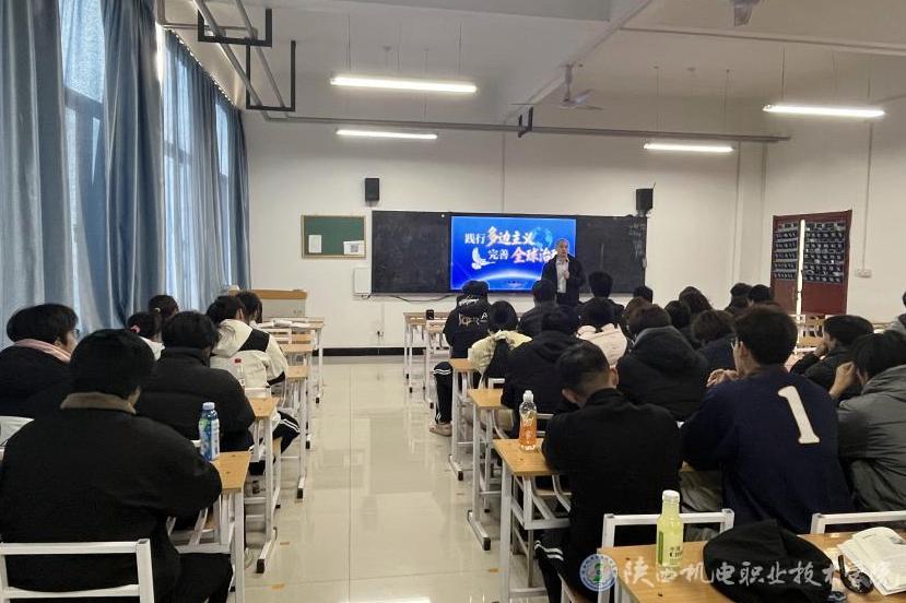 12月25日下午,陜西機(jī)電職業(yè)技術(shù)學(xué)院黨委副書記、校長侯曉方在博學(xué)樓213教室為25現(xiàn)代通信1、25現(xiàn)代通信2合班學(xué)生講授形勢與政策課《踐行多邊主義 完善全球治理》專題內(nèi)容。