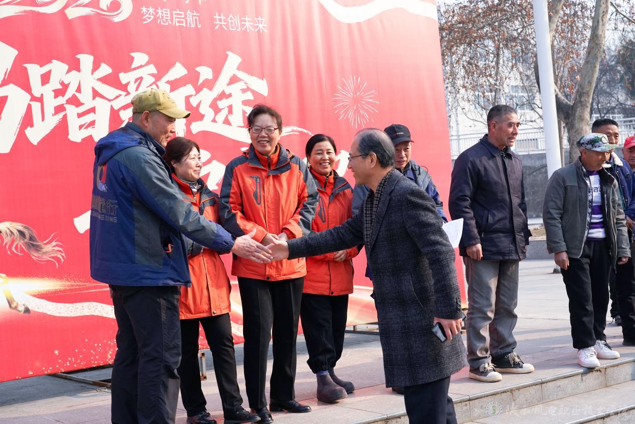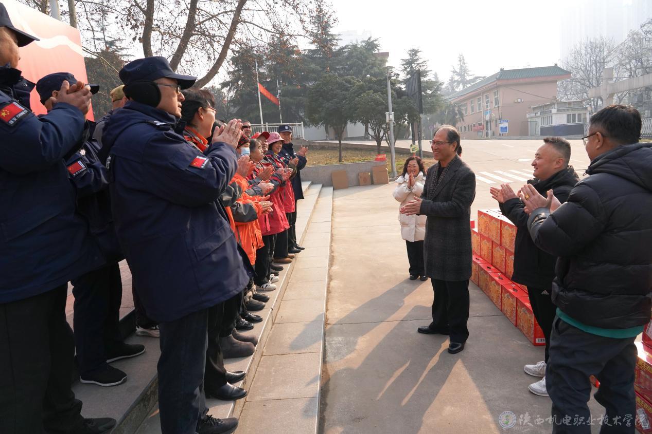 來自門崗、巡邏、消防控制室、維修、保潔、公寓值班、鍋爐房以及學(xué)校值班教師等各個(gè)崗位的值班人員齊聚至小廣場(chǎng)處,現(xiàn)場(chǎng)氣氛溫馨而熱烈。伊遜智與大家親切交談,詳細(xì)詢問節(jié)日期間的工作和生活情況,對(duì)大家“舍小家、顧大家”的奉獻(xiàn)精神表示衷心感謝。他強(qiáng)調(diào),校園安全穩(wěn)定和各項(xiàng)保障工作離不開每一位值班人員的辛勤付出,希望大家繼續(xù)發(fā)揚(yáng)敬業(yè)精神,嚴(yán)格落實(shí)值班制度,確保寒假期間校園平安和諧。