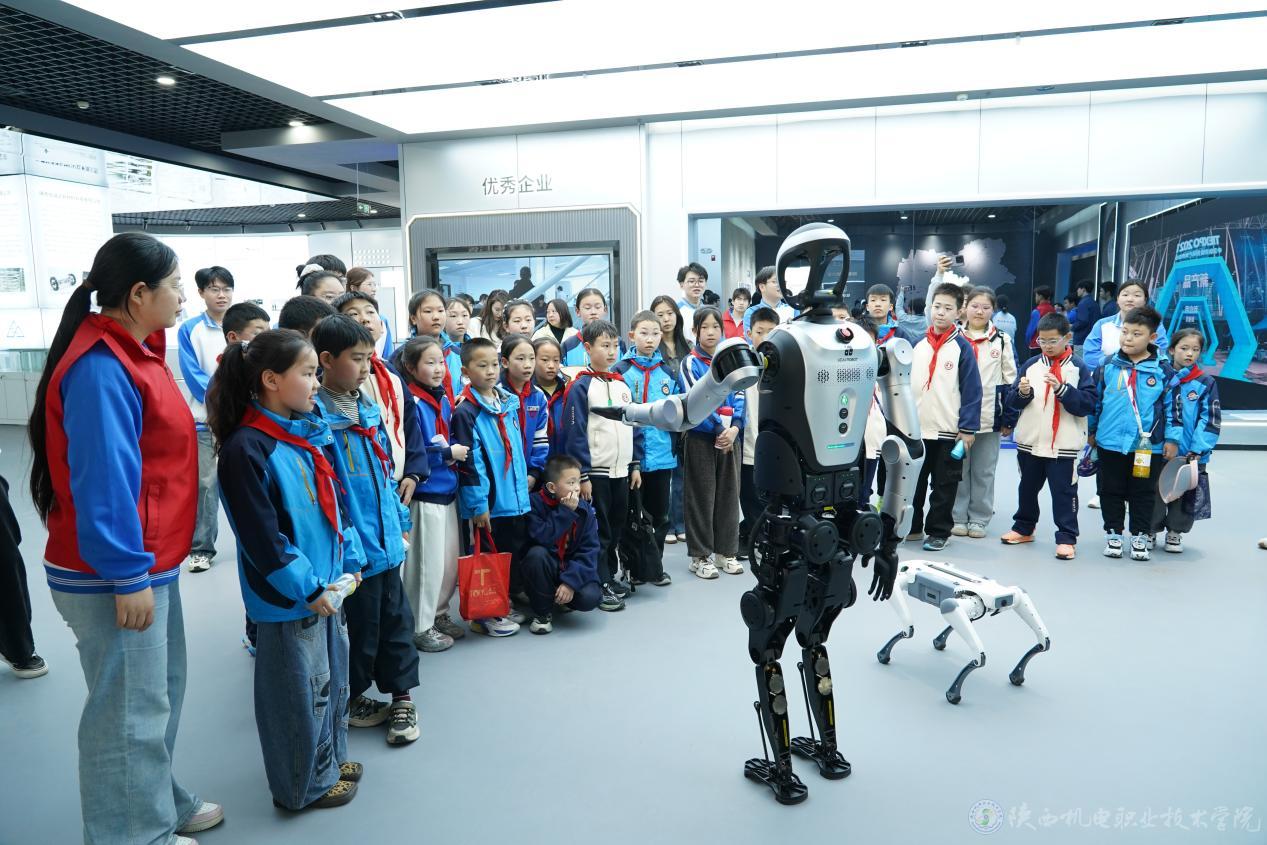 活動中,小學(xué)生們以“小小工程師”身份,依次參觀了鈦展館、全息投影實訓(xùn)室、風(fēng)標(biāo)產(chǎn)業(yè)學(xué)院、精雕智造中心及多個機器人實訓(xùn)室,近距離觀察鈦合金樣品,體驗全息互動,了解數(shù)控機床與智能制造。在匠心樓,工業(yè)機器人展示寫毛筆字、畫圖、走迷宮等技能;雙臂機器人、自動化產(chǎn)線及臊子面智能產(chǎn)線演示引人入勝。最后,機器狗與人形機器人的精彩表演贏得孩子們陣陣歡呼。