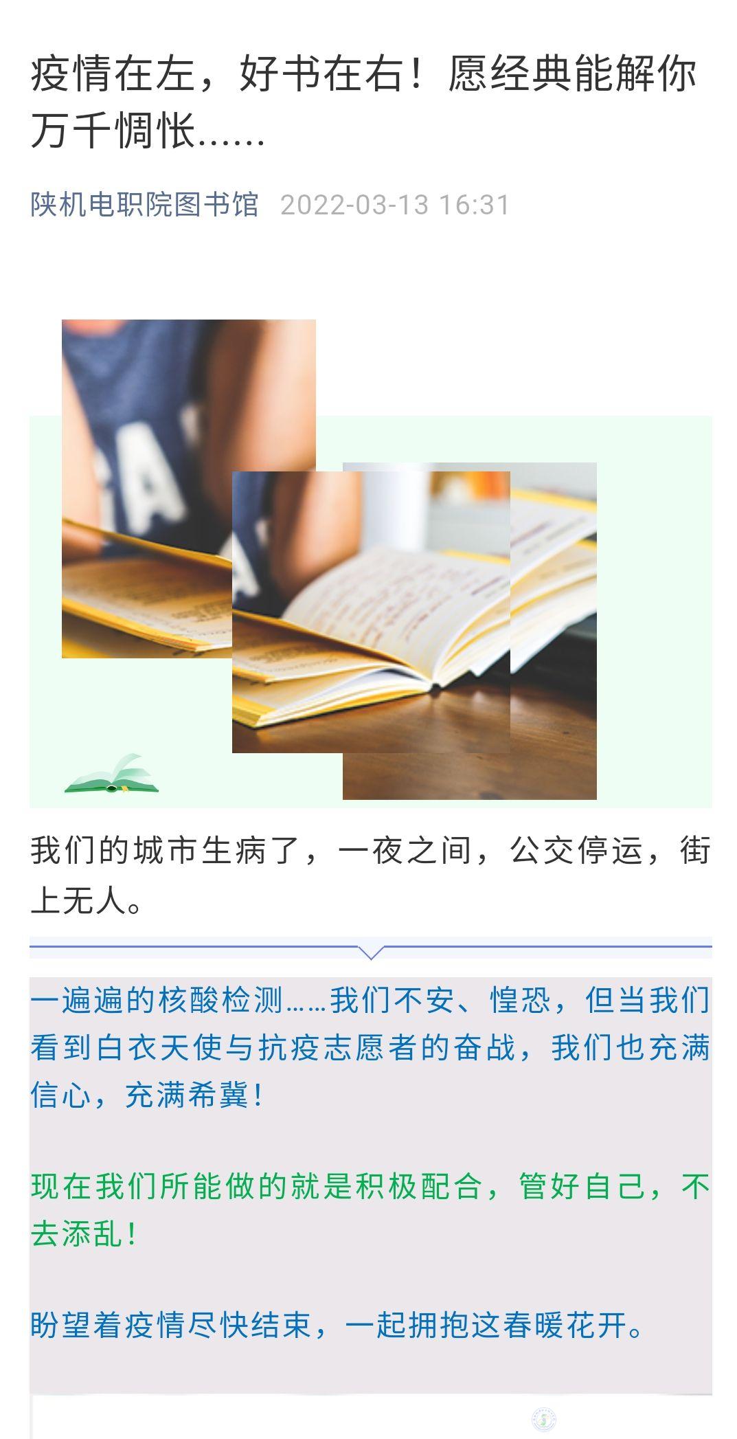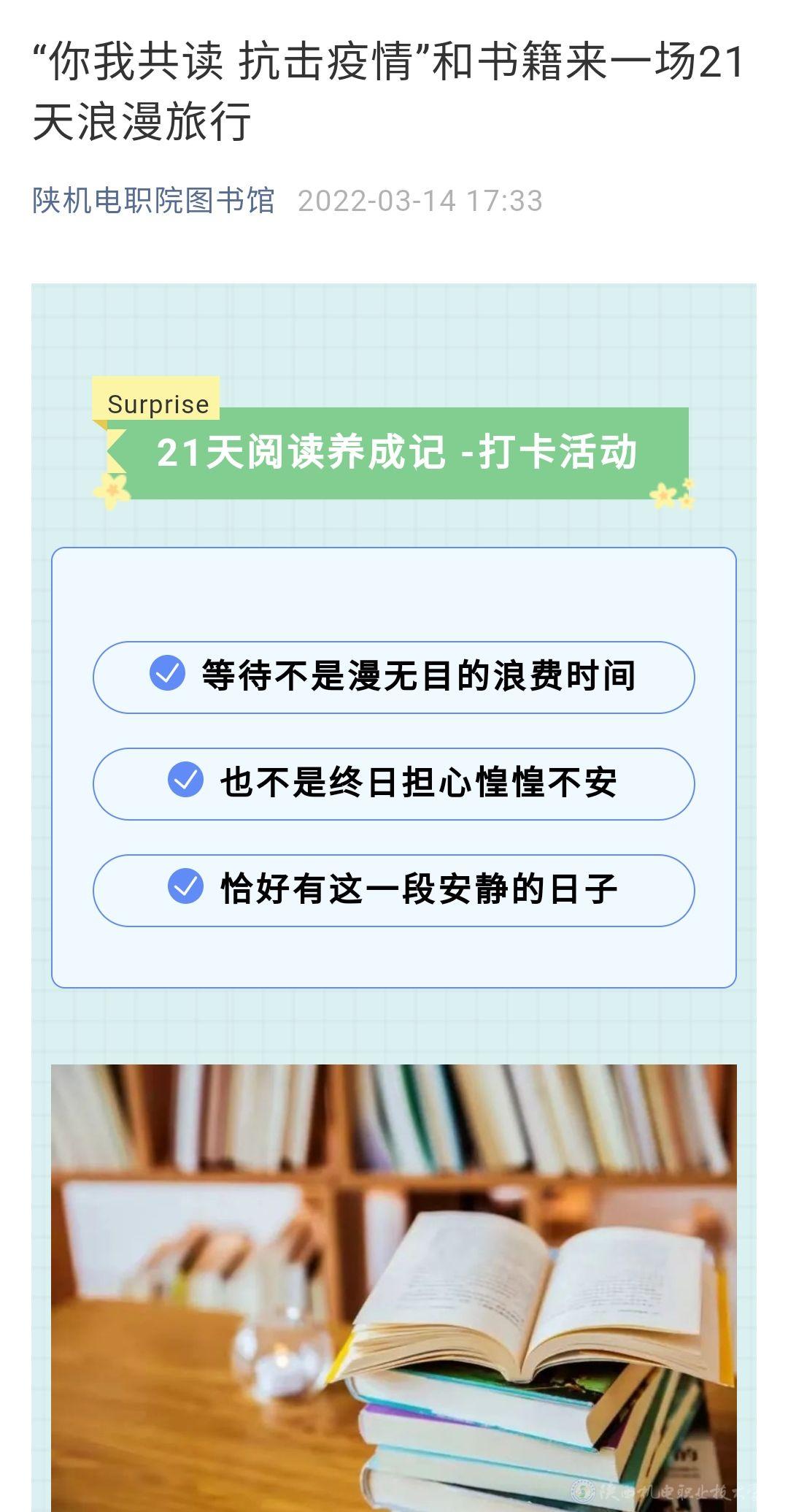 2、為豐富師生疫情防控期間的精神文化生活,堅(jiān)定戰(zhàn)勝疫情的信心,圖書館及時(shí)調(diào)整服務(wù)方案,從線下轉(zhuǎn)線上,從紙質(zhì)變電子,充分利用網(wǎng)絡(luò)平臺(tái)和微信公眾號(hào),QQ群等加強(qiáng)線上服務(wù)及閱讀推廣,發(fā)布了“疫情在左,好書在右!愿經(jīng)典能解你萬(wàn)千惆悵”和組織開展“你我共讀,抗擊疫情”21天閱讀打卡活動(dòng)。