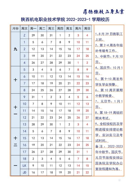 陜西機(jī)電職業(yè)技術(shù)學(xué)院2022-2023-1學(xué)期校歷