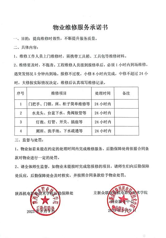 致廣大師生——后勤保障處物業(yè)維修服務承諾
