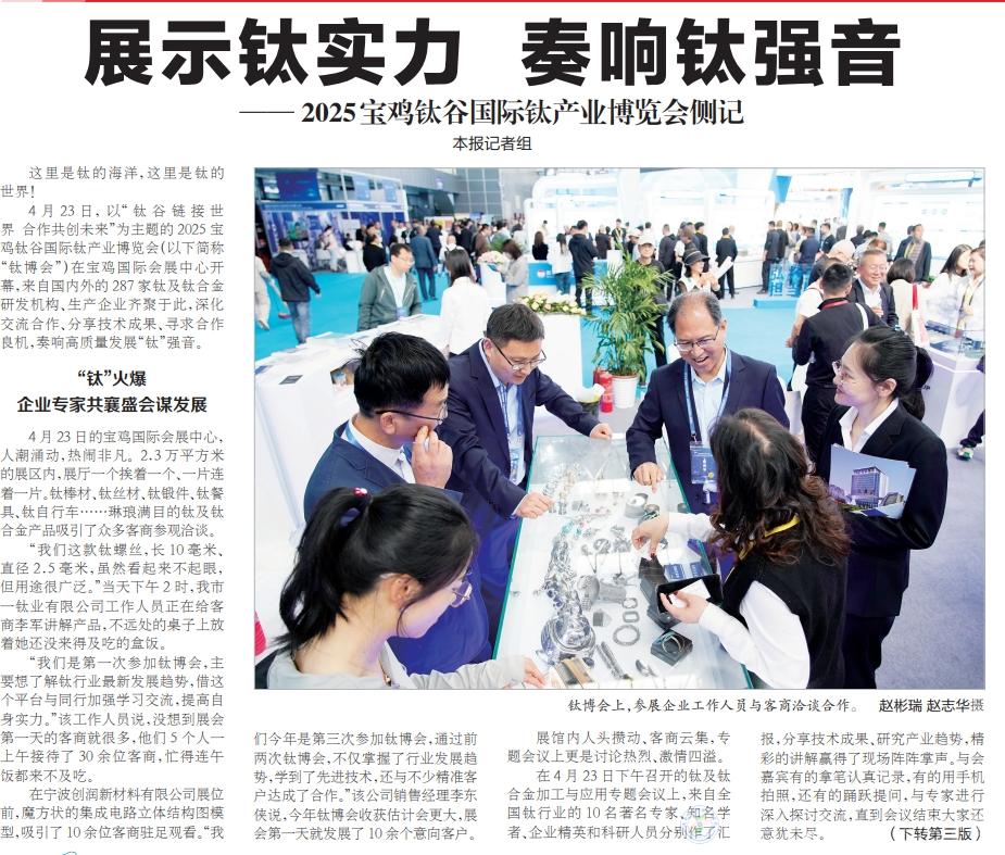 4月23日,以“鈦谷鏈接世界合作共創(chuàng)未來”為主題的2025寶雞鈦谷國際鈦產業(yè)博覽會(以下簡稱“鈦博會”)在寶雞國際會展中心開幕,來自國內外的287家鈦及鈦合金研發(fā)機構、生產企業(yè)齊聚于此,深化交流合作、分享技術成果、尋求合作良機,奏響高質量發(fā)展“鈦”強音。