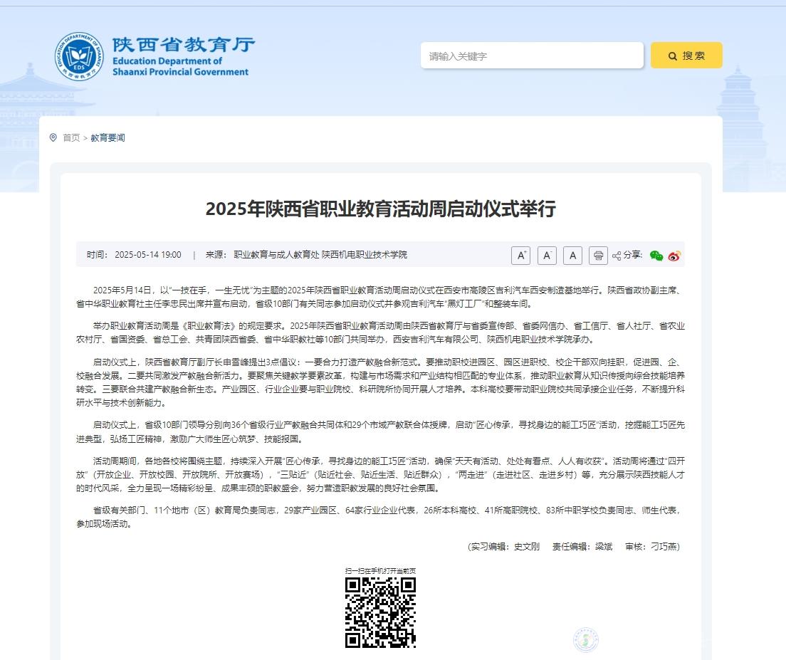舉辦職業(yè)教育活動周是《職業(yè)教育法》的規(guī)定要求。2025年陜西省職業(yè)教育活動周由陜西省教育廳與省委宣傳部、省委網(wǎng)信辦、省工信廳、省人社廳、省農(nóng)業(yè)農(nóng)村廳、省國資委、省總工會、共青團(tuán)陜西省委、省中華職教社等10部門共同舉辦,西安吉利汽車有限公司、陜西機(jī)電職業(yè)技術(shù)學(xué)院承辦。