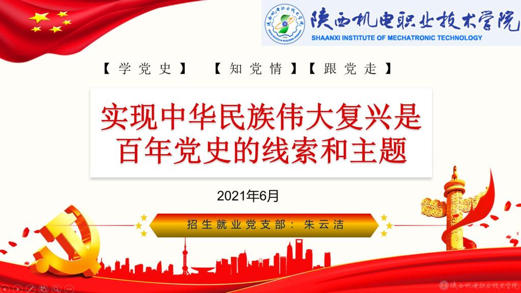 在中國共產(chǎn)黨建黨100周年來臨之際,6月2日上午,招生就業(yè)黨支部召開支部會(huì)議,由支部書記朱云潔以《實(shí)現(xiàn)中華民族偉大復(fù)興是百年黨史的線索和主題》為題,給支部黨員講黨課。學(xué)校黨委委員徐圣月、招生就業(yè)黨支部全體黨員參加會(huì)議。