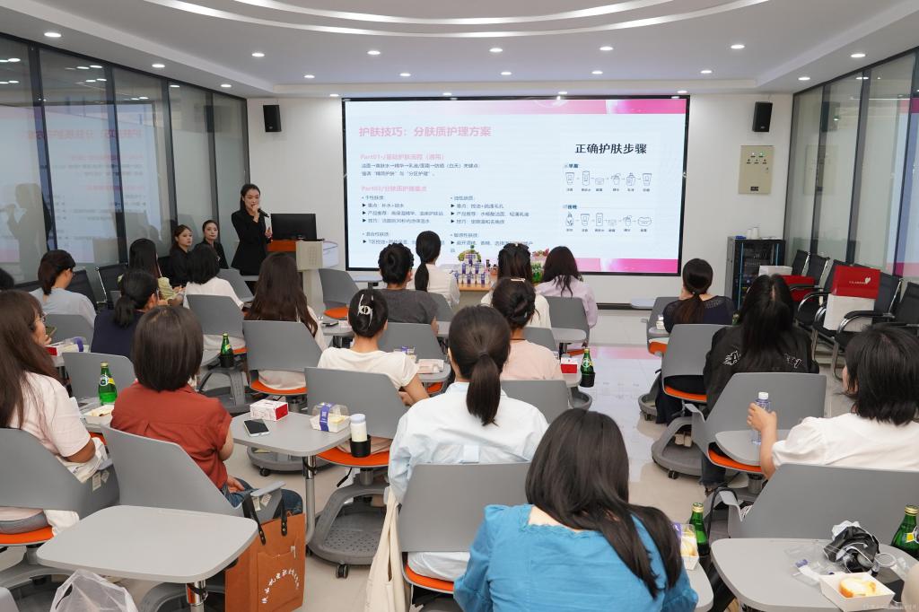 本次活動(dòng)特邀寶雞市開(kāi)元商城資深美妝團(tuán)隊(duì)。專業(yè)講師首先聚焦夏季肌膚科學(xué)護(hù)理,深入剖析了外源性衰老成因,并通過(guò)互動(dòng)問(wèn)答引導(dǎo)大家精準(zhǔn)識(shí)別自身膚質(zhì),針對(duì)性地傳授了分膚質(zhì)精簡(jiǎn)護(hù)理方案與關(guān)鍵護(hù)膚流程。隨后,課程重點(diǎn)轉(zhuǎn)向高效通勤與得體職場(chǎng)妝容的打造,講師現(xiàn)場(chǎng)拆解了“10分鐘快速通勤妝”的核心步驟,在“模特”老師的配合下,現(xiàn)場(chǎng)演示了“完美職場(chǎng)妝”的進(jìn)階技巧,包括精準(zhǔn)遮瑕、霧面底妝與立體修容的搭配法則。令在場(chǎng)教職工受益匪淺。每位參與者領(lǐng)取到了品牌護(hù)膚品及化妝品體驗(yàn)裝作為貼心伴手禮。