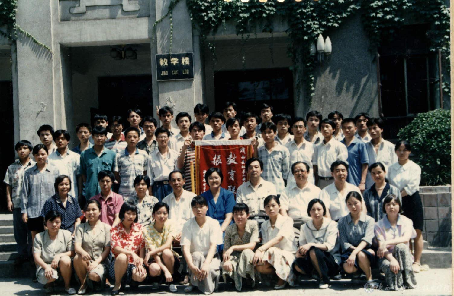 1988年9月 全體教職工在長嶺實習基地門前合影(身后懸掛第一塊校牌)